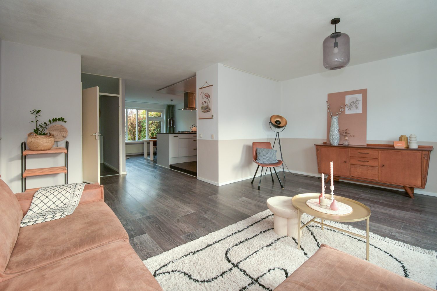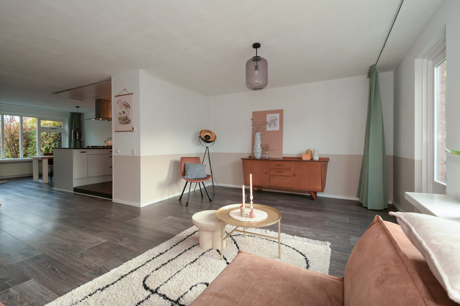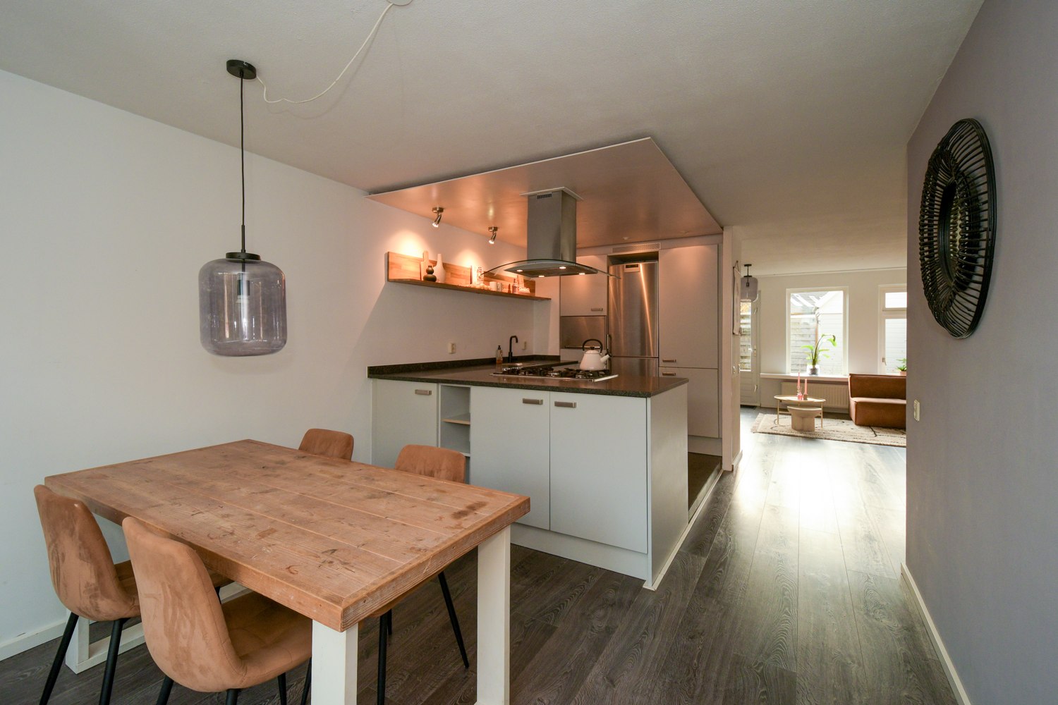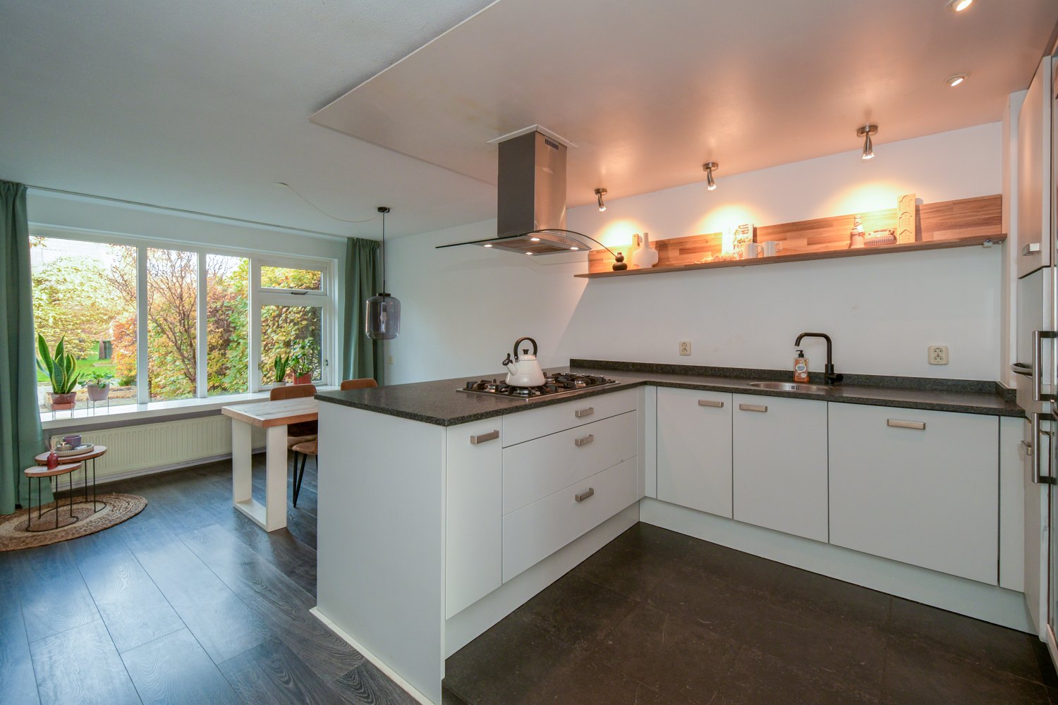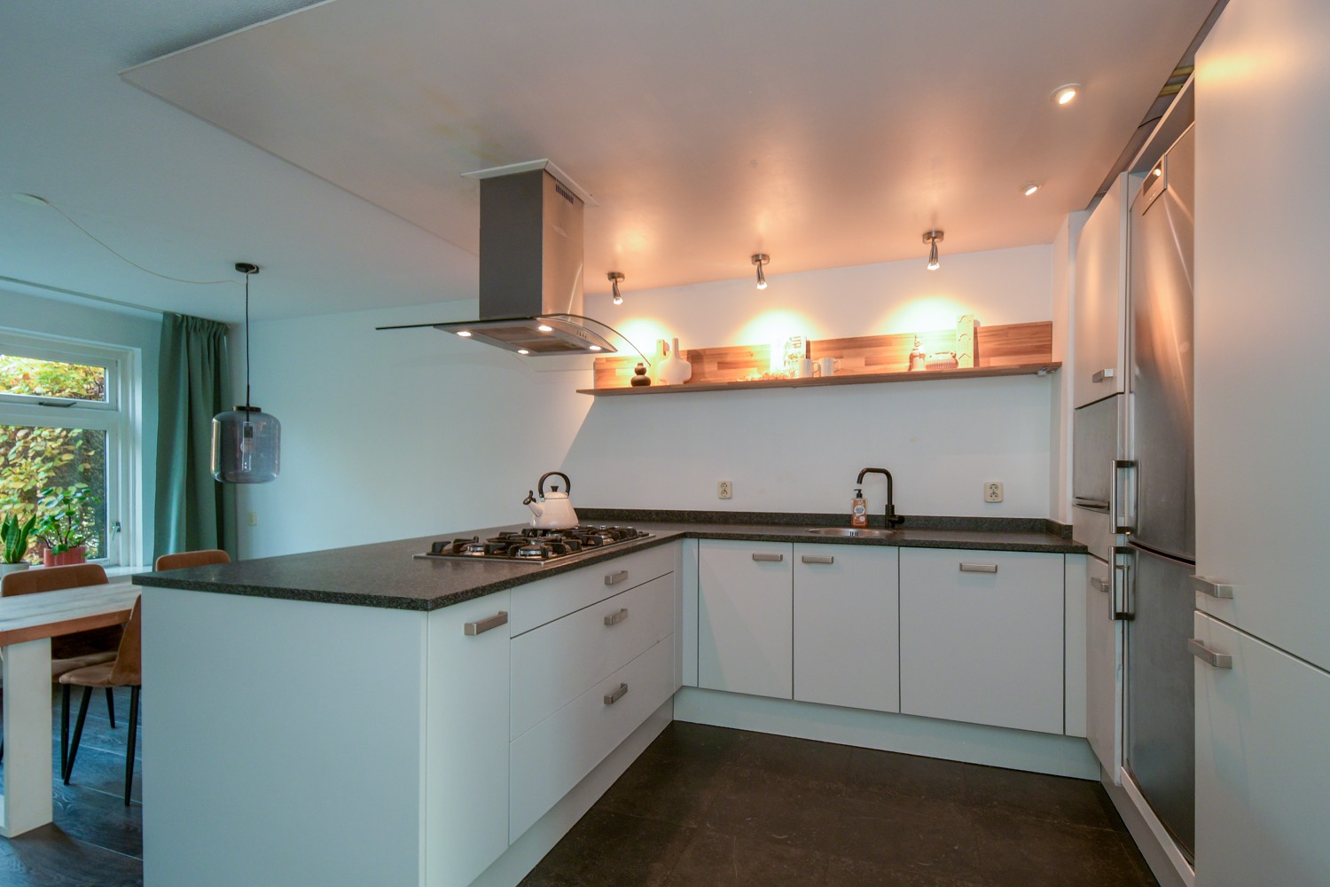 Aan de achterzijde van de living vind je de tuingerichte, royale woonkamer. De zeer ruime open keuken met schiereiland in lichte kleurstelling vormt een mooie natuurlijke scheiding tussen het zitgedeelte en de eethoek. De keuken is voorzien van veel opbergruimte en diverse inbouwapparatuur. Aan de voorzijde van de woning is ruimte voor een gezellige eethoek. De diepe, groene voortuin zorgt voor veel privacy.