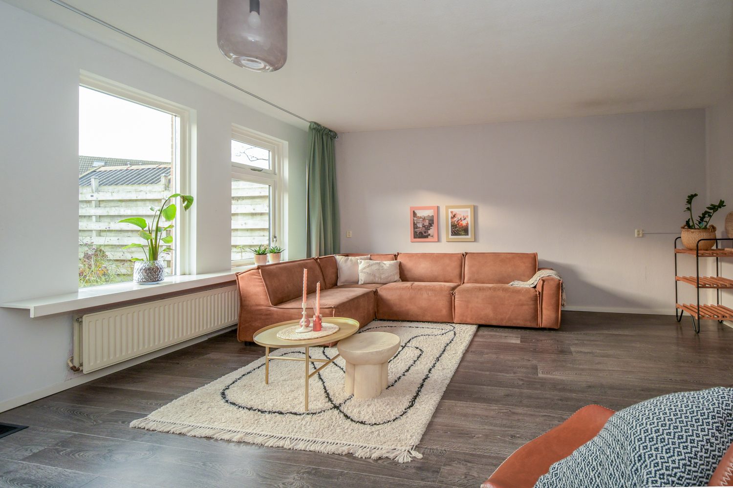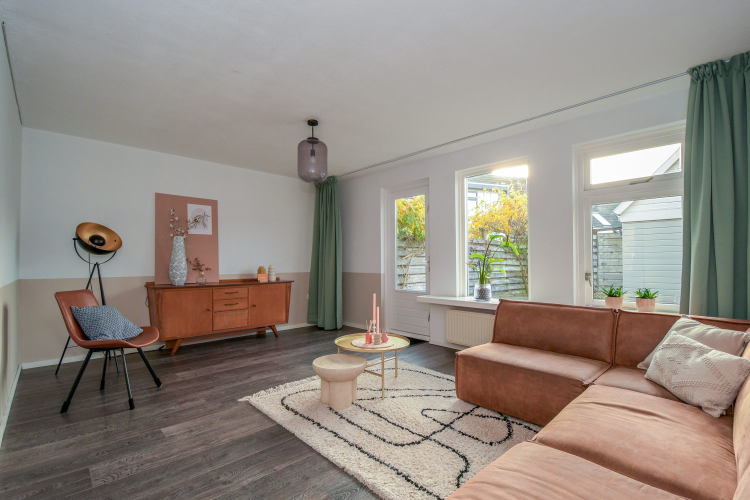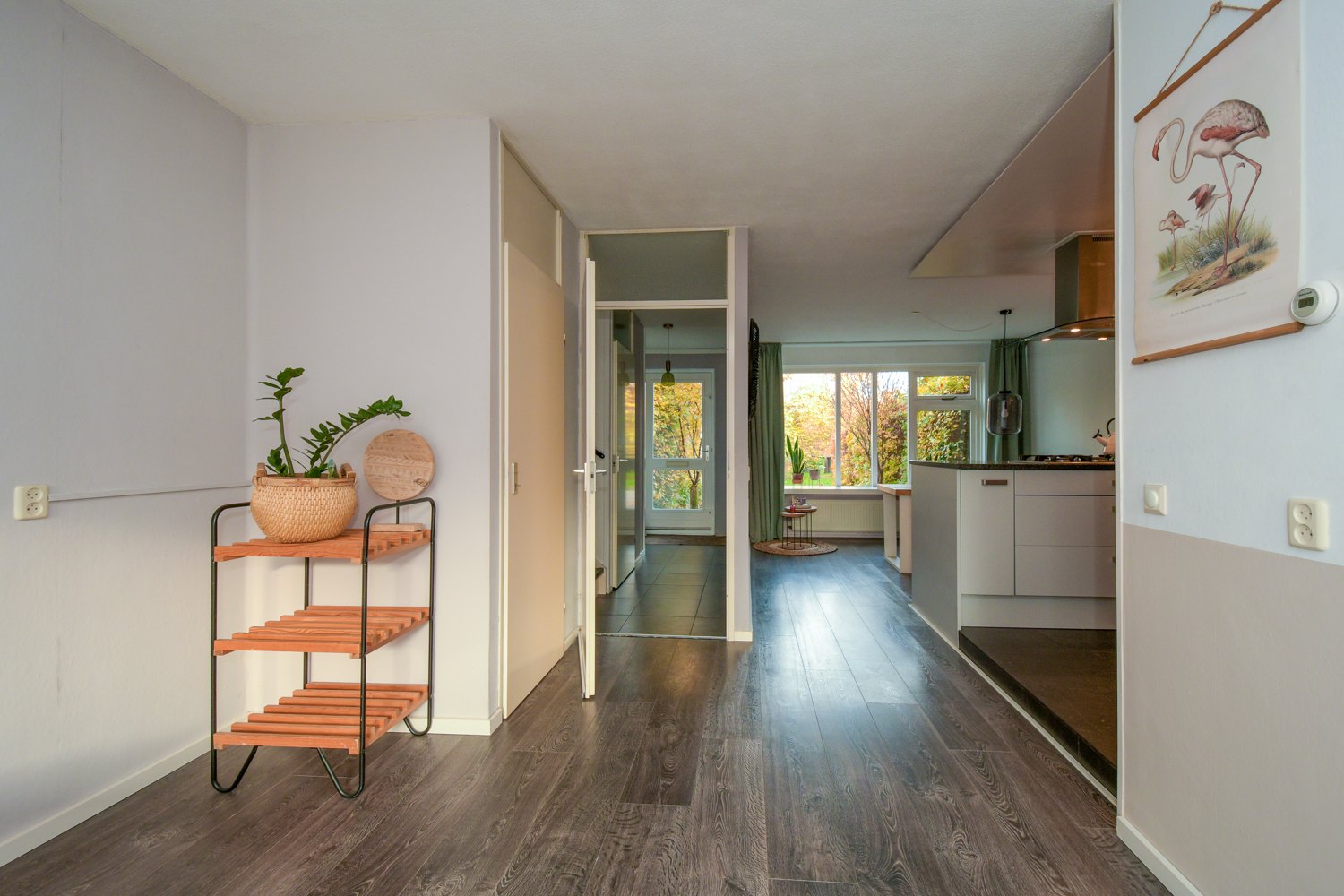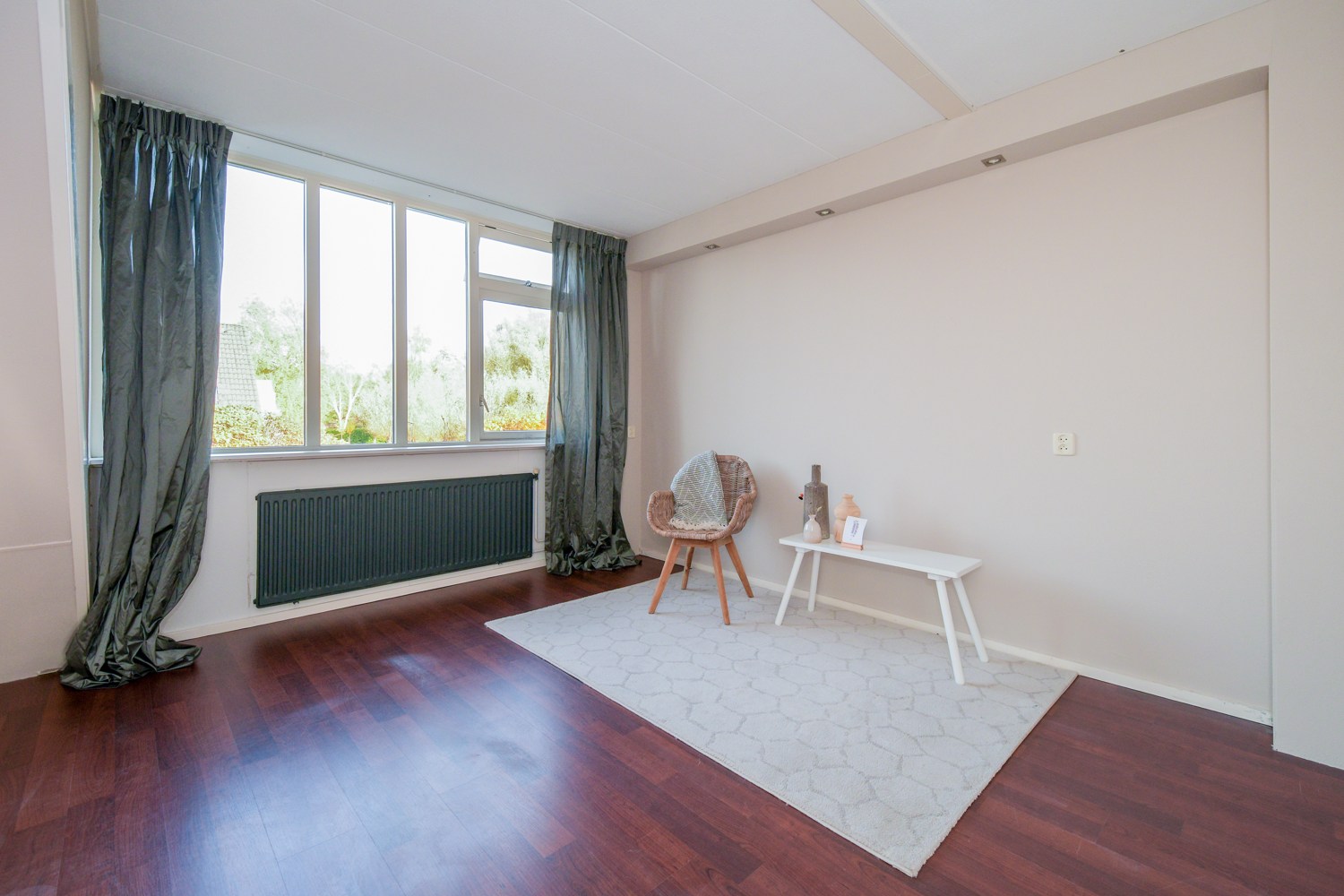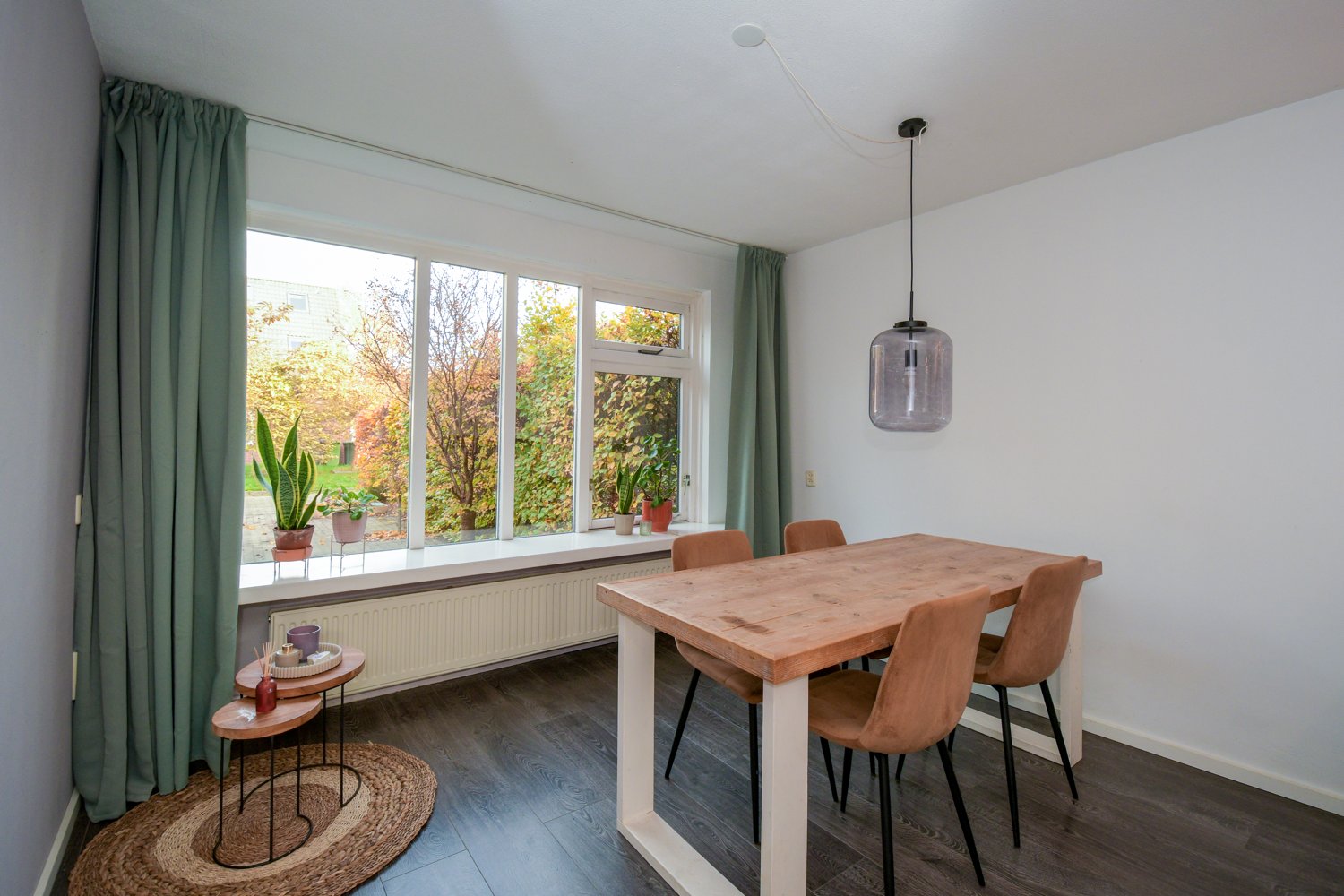 Aan de achterzijde van de living vind je de tuingerichte, royale woonkamer. De zeer ruime open keuken met schiereiland in lichte kleurstelling vormt een mooie natuurlijke scheiding tussen het zitgedeelte en de eethoek. De keuken is voorzien van veel opbergruimte en diverse inbouwapparatuur. Aan de voorzijde van de woning is ruimte voor een gezellige eethoek. De diepe, groene voortuin zorgt voor veel privacy.