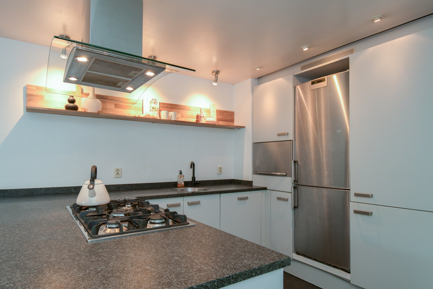De keuken met schiereiland en veel opbergruimte beschikt over diverse inbouwapparatuur, waaronder; 6-pits gasfornuis, koel-vries combinatie, afzuigkap en een vaatwasser.