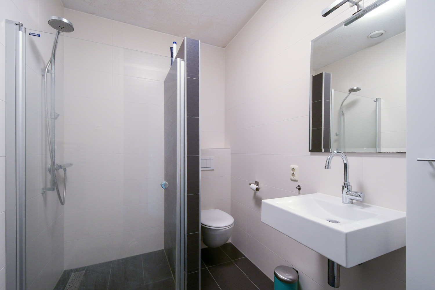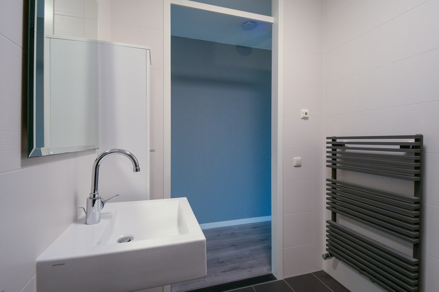 Via de hal kom je in de moderne luxe badkamer, voorzien van inloopdouche, wastafelmeubel en toilet (wandcloset). Naast de badkamer is er een bijkeuken/berging waar zich de witgoed-aansluitingen, HR CV ketel (intergas) en de WTW installatie (Renovent HR) bevinden. De gezellige en sfeervolle woon/slaapkamer heeft een prachtig vrij uitzicht.