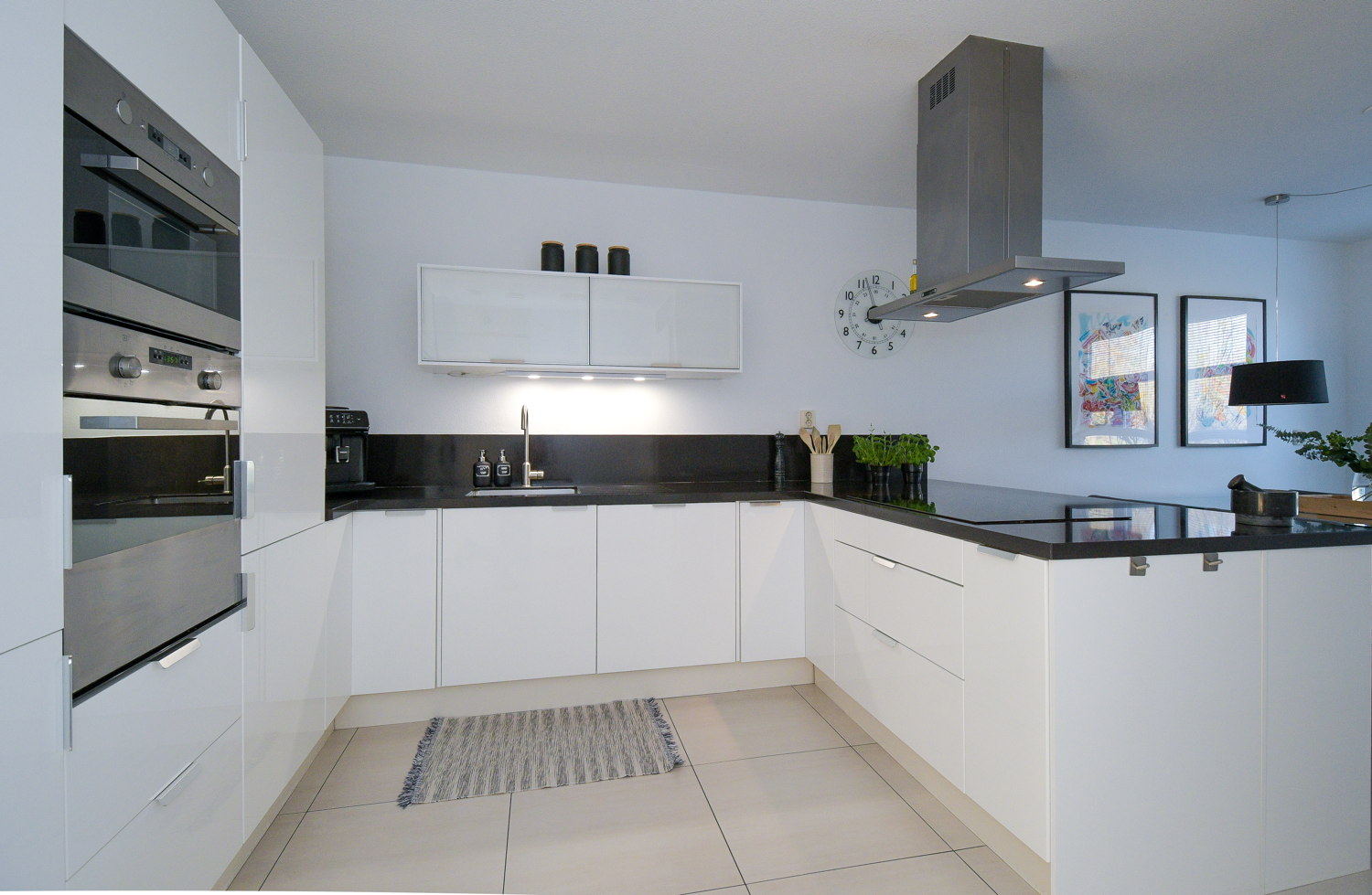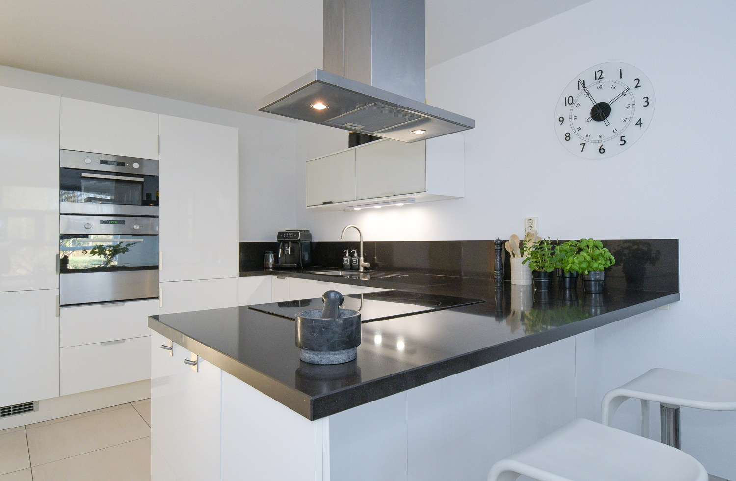 De achterzijde van de woning is voorzien van een stijlvolle uitbouw met fraaie overstek. Door de vele raampartijen en de grote schuifpui geniet je hier van een maximale lichtinval en betrek je terras en de tuin, op het zuiden gelegen, bij de woonruimte. De begane grond beschikt over een plavuizen vloer met comfortabele vloerverwarming. De moderne luxe leefkeuken voldoet aan alle hedendaagse wensen.
