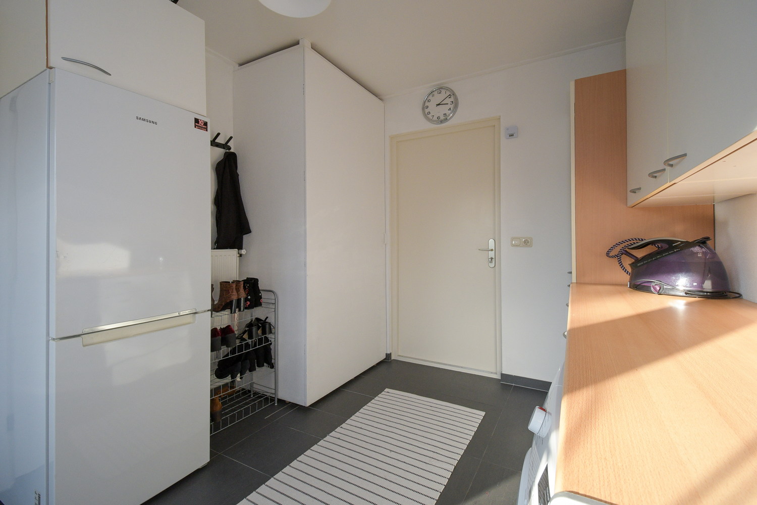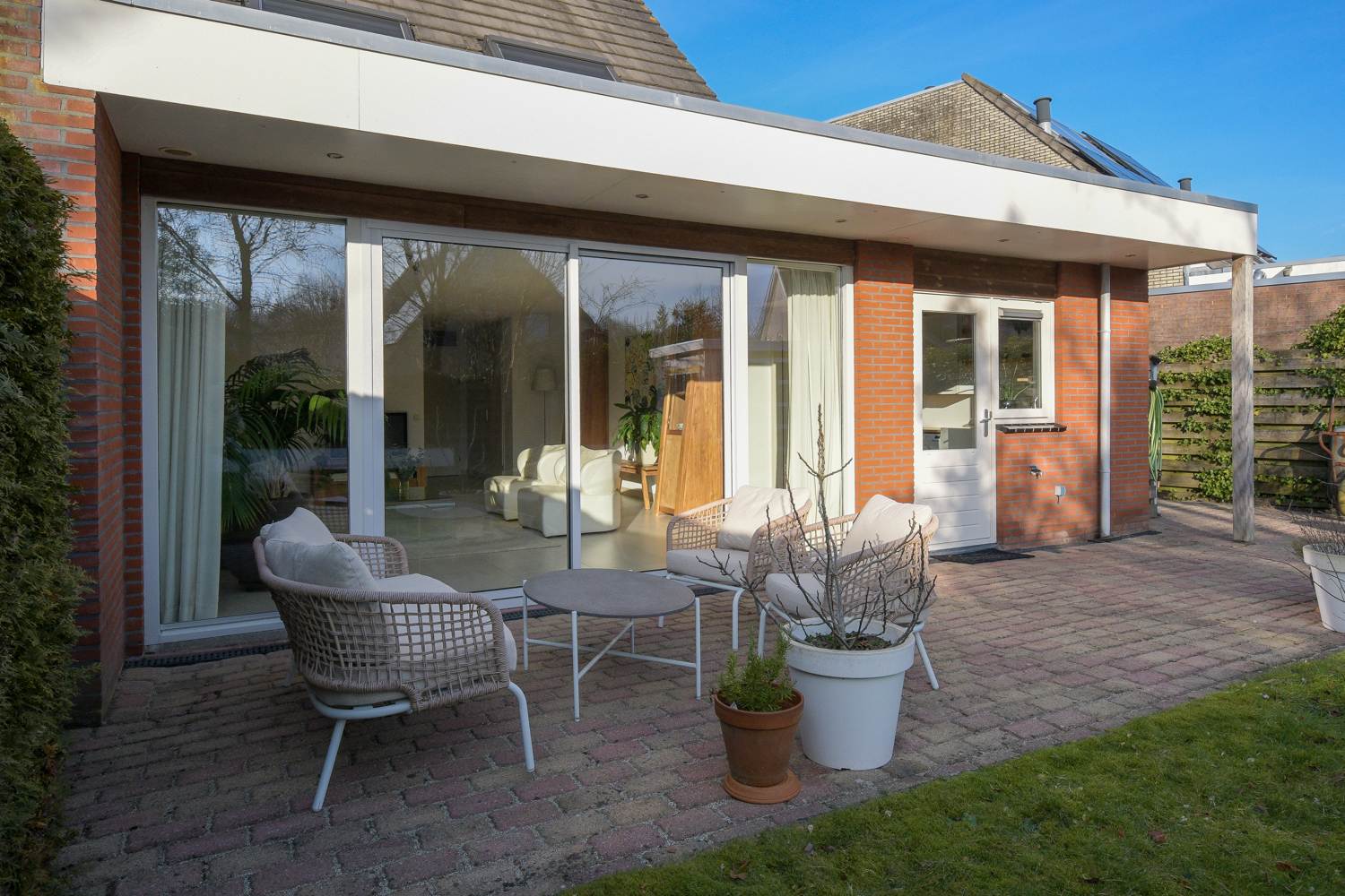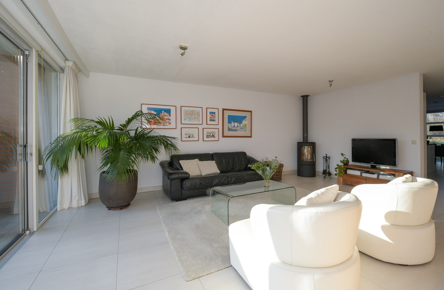 De moderne luxe keuken beschikt over diverse inbouwapparatuur, waaronder; vaatwasser, inductiekookplaat, heteluchtoven, magnetron en koel/vries combinatie. In de ruime woonkamer en keuken ligt een mooie plavuizen vloer met vloerverwarming. De woonkamer met sfeervolle houtkachel is tuingericht en uitgebouwd aan de achterzijde. Door de vele raampartijen en de grote schuifpui geniet je hier van maximale lichtinval en betrek je de tuin en terras bij de woonruimte. De woonkamer biedt toegang tot de geïsoleerde bijkeuken waar zich de witgoed-aansluitingen, de HR CH ketel en het boilervat t.b.v. het verwarmen van het tapwater bevinden. Vanuit de bijkeuken kom je in de garage en is er toegang tot de tuin.