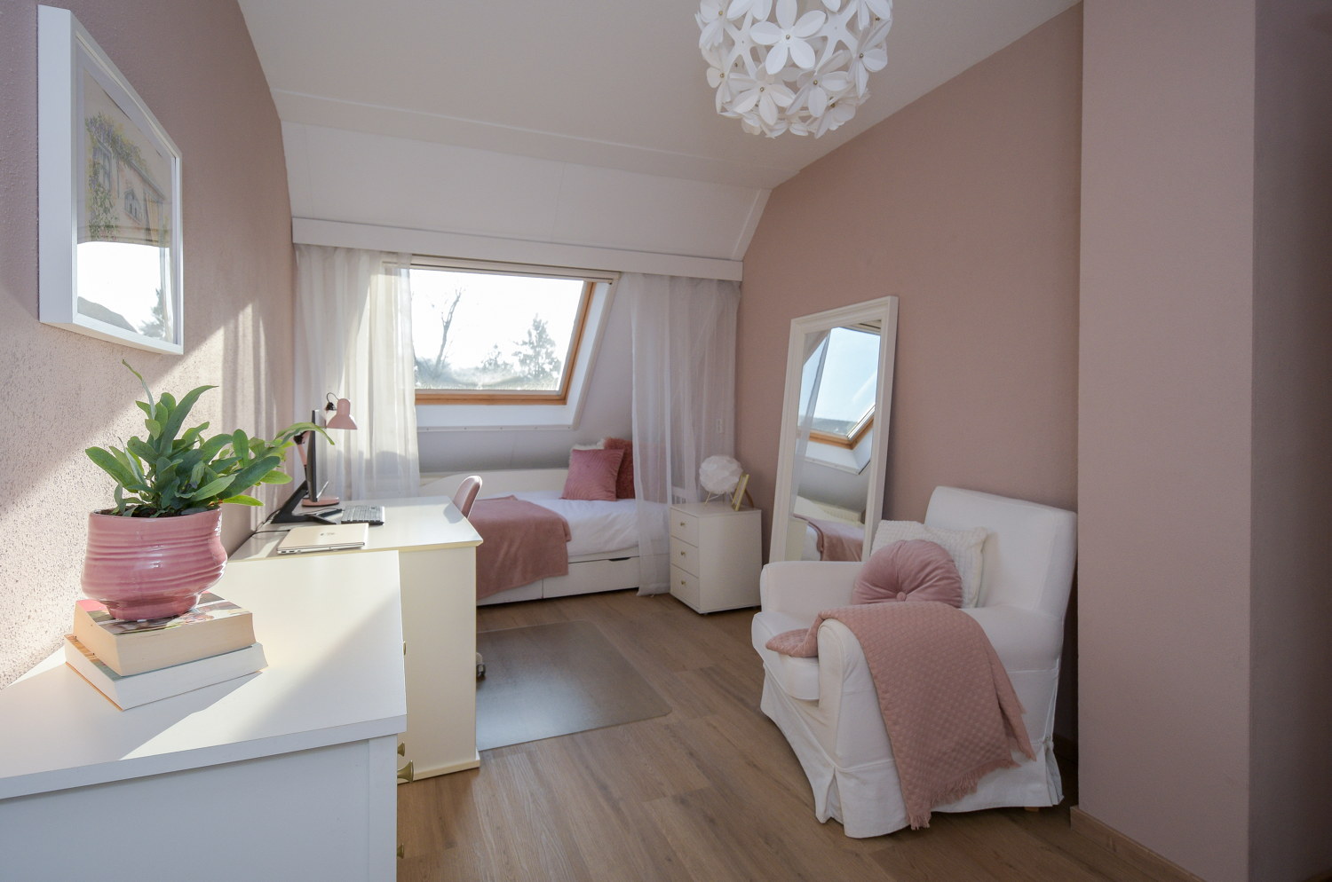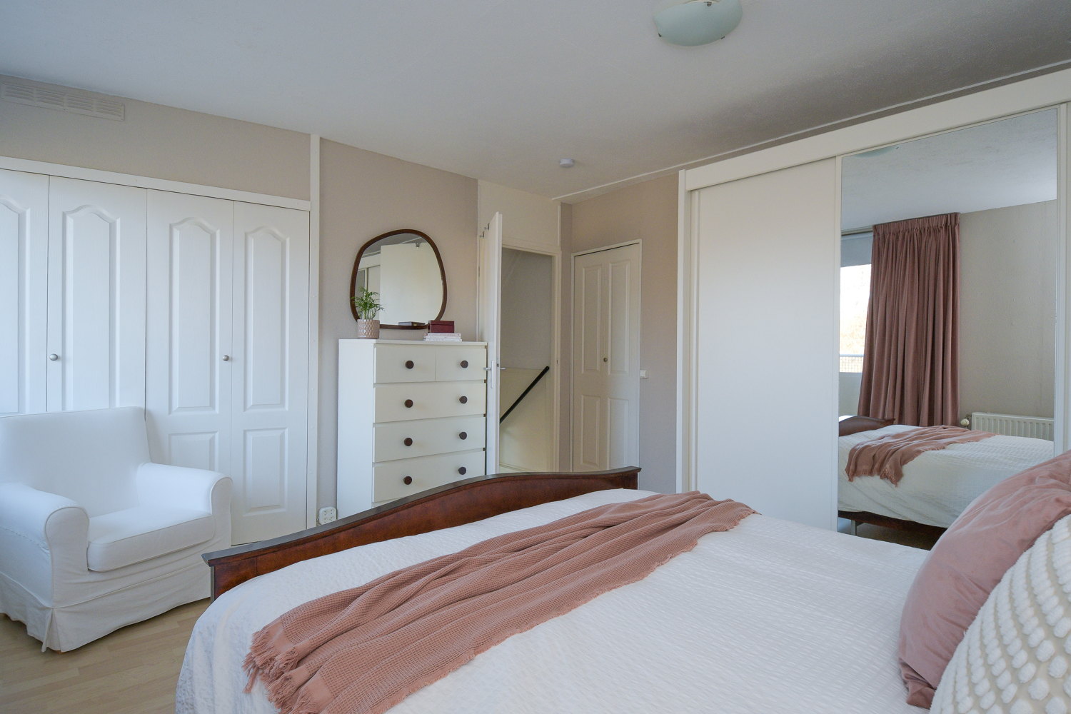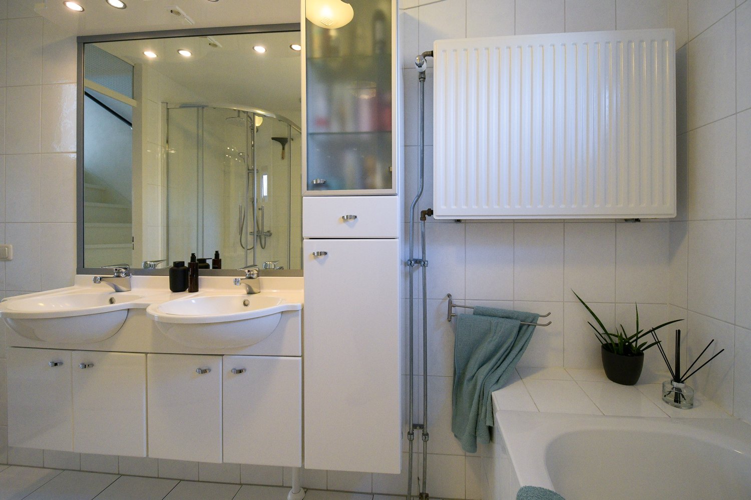 Op de eerste verdieping bevinden zich drie slaapkamers met een oppervlakte van respectievelijk ca 12,3 m2 , 8,7 m2 en 12,5 m2. De slaapkamers hebben laag temperatuur radiatoren waardoor de woning bijzonder geschikt is voor verdere verduurzaming. De complete badkamer in lichte kleurstelling en met vloerverwarming is goed onderhouden en voorzien van ligbad, douchehoek, extra toilet en 2 wastafels.