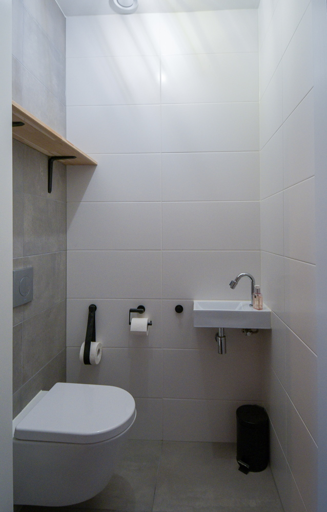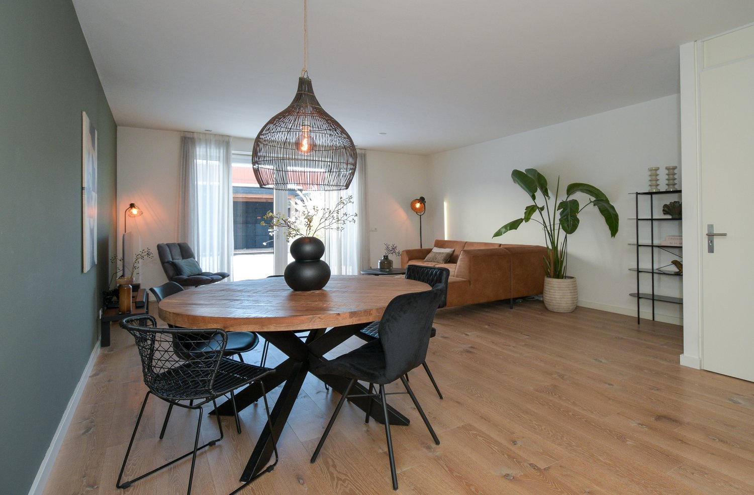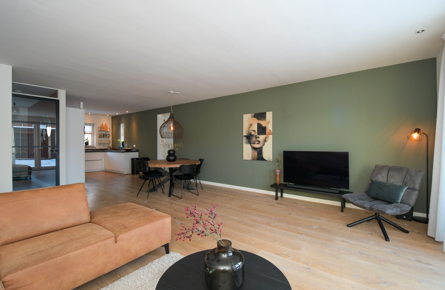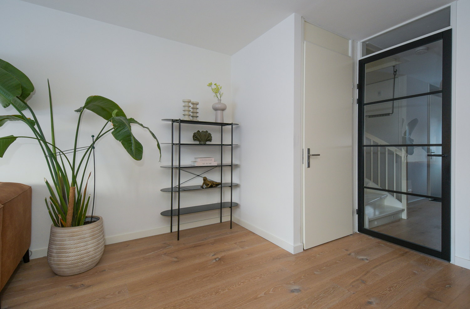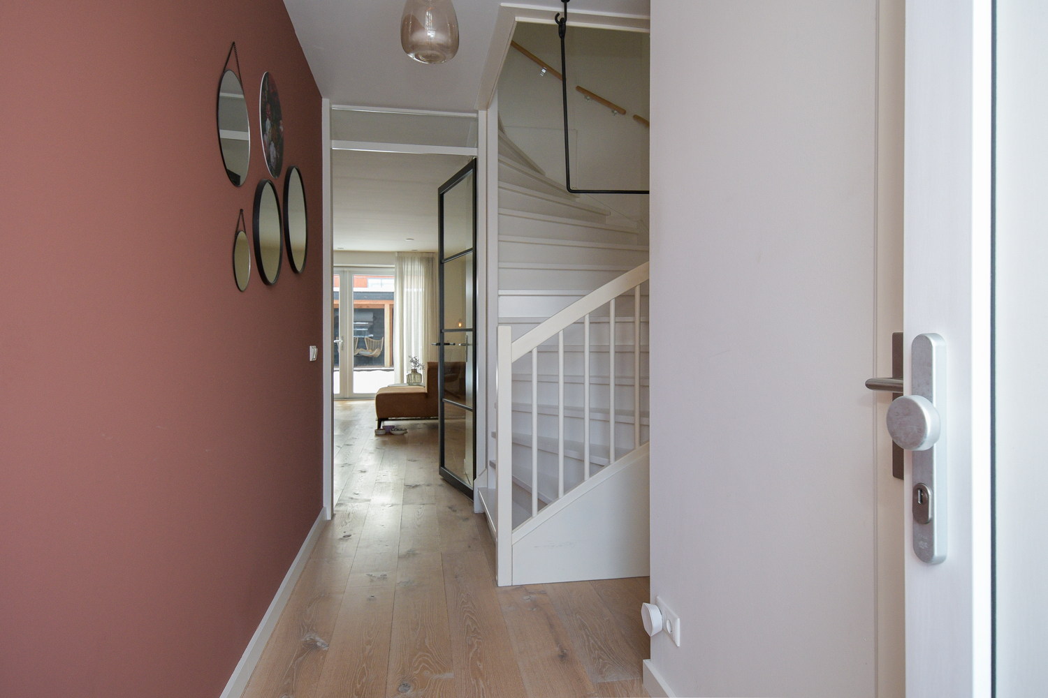 Entree, modern toilet (wandcloset) met fonteintje, meterkast, trapopgang naar eerste verdieping. De stijlvolle stalen scharnierdeur geeft toegang tot de woonkamer, is vervaardigd uit zwart, gepoedercoat staal en geeft door het glas een ruimtelijk effect. De woonkamer is tijdens de bouw met 2,4 meter uitgebouw waardoor er een grote lichte ruimte is gecreëerd met openslaande tuindeuren naar het terras. Op de vloer ligt een warme sfeervolle eiken houten vloer puur wit 22 cm breed met vloerverwarming.