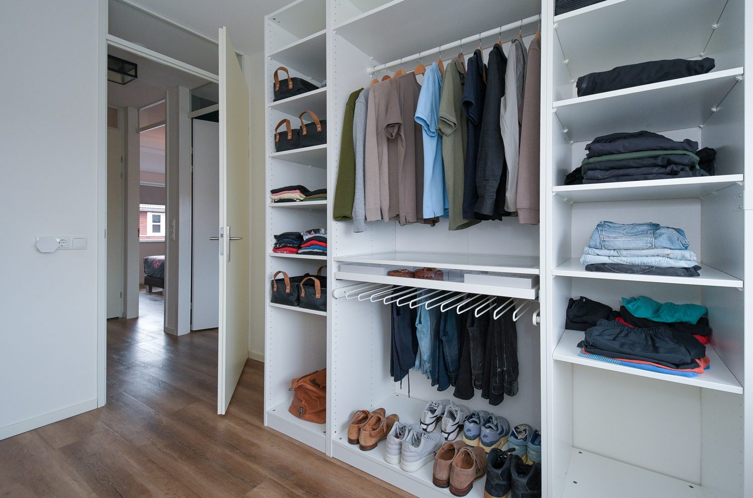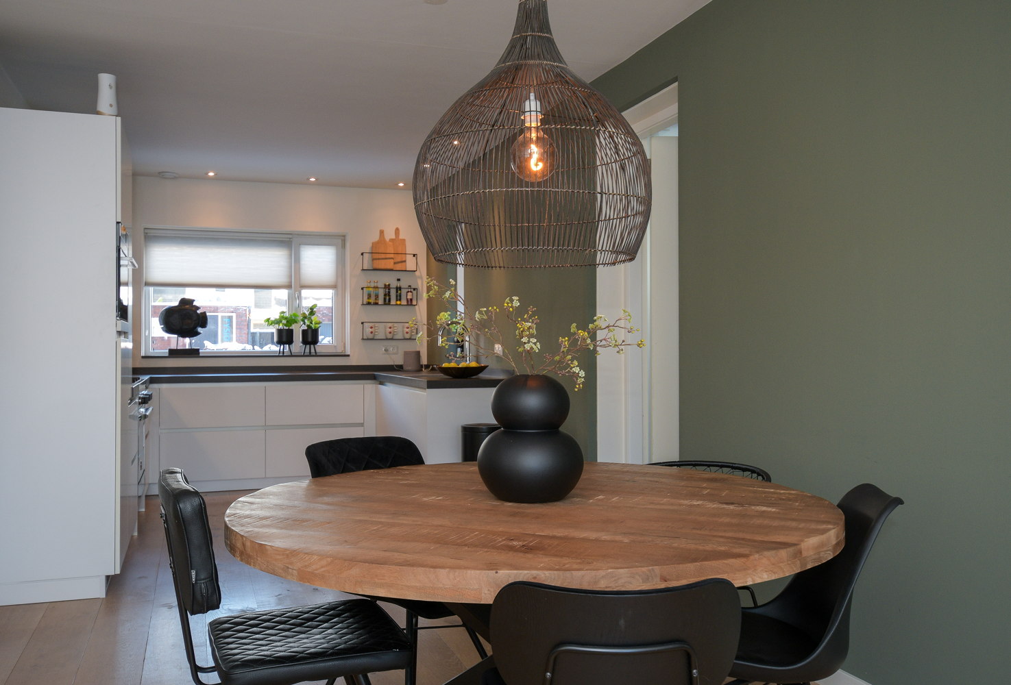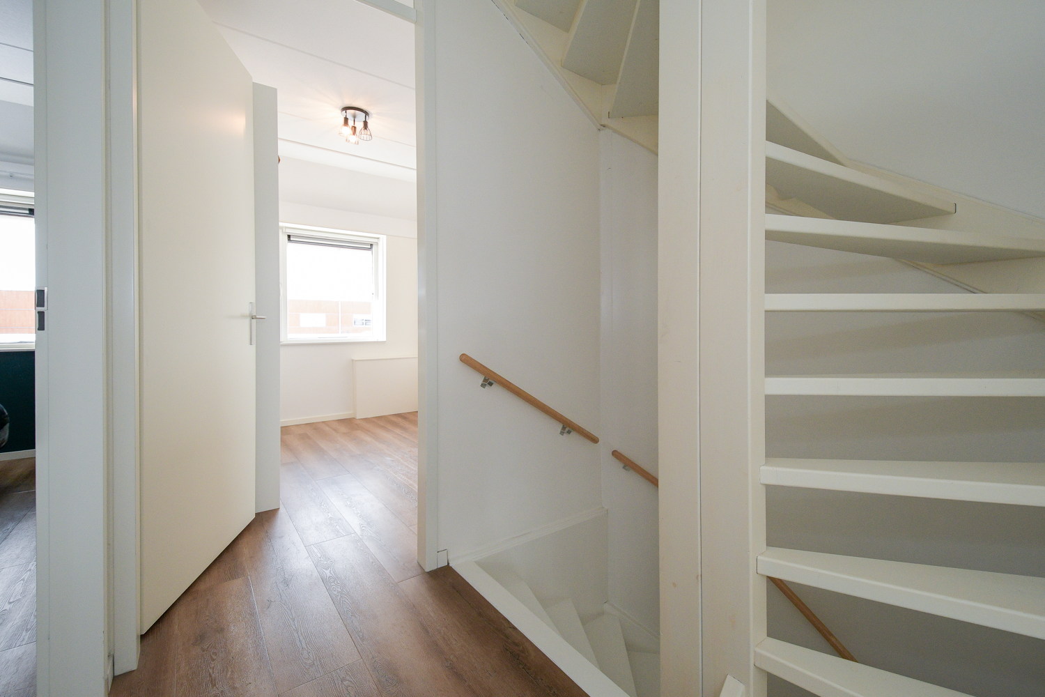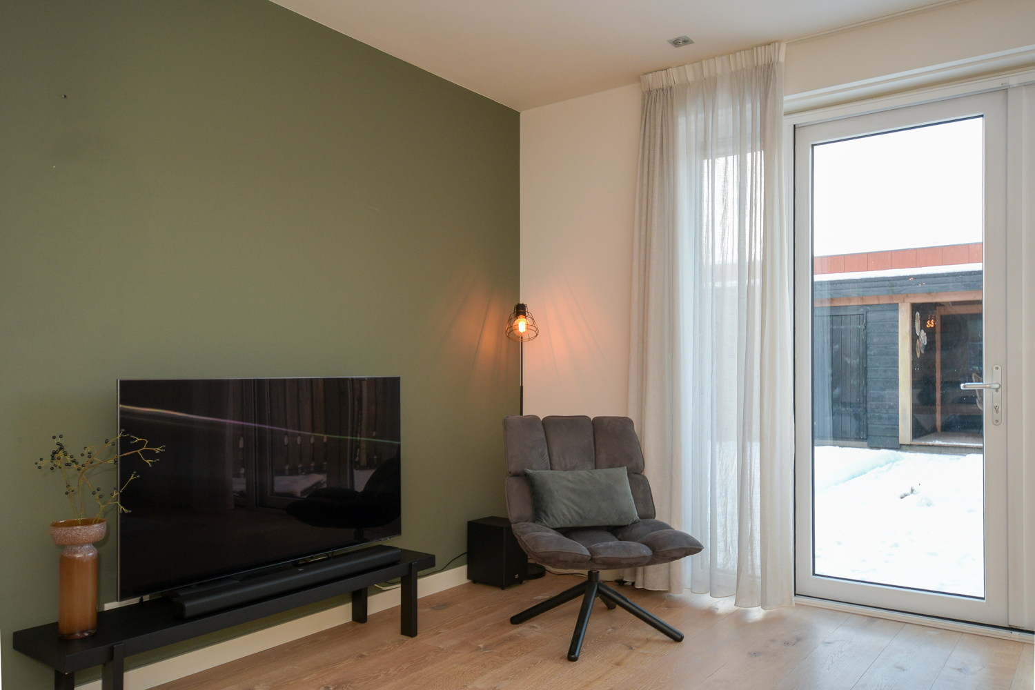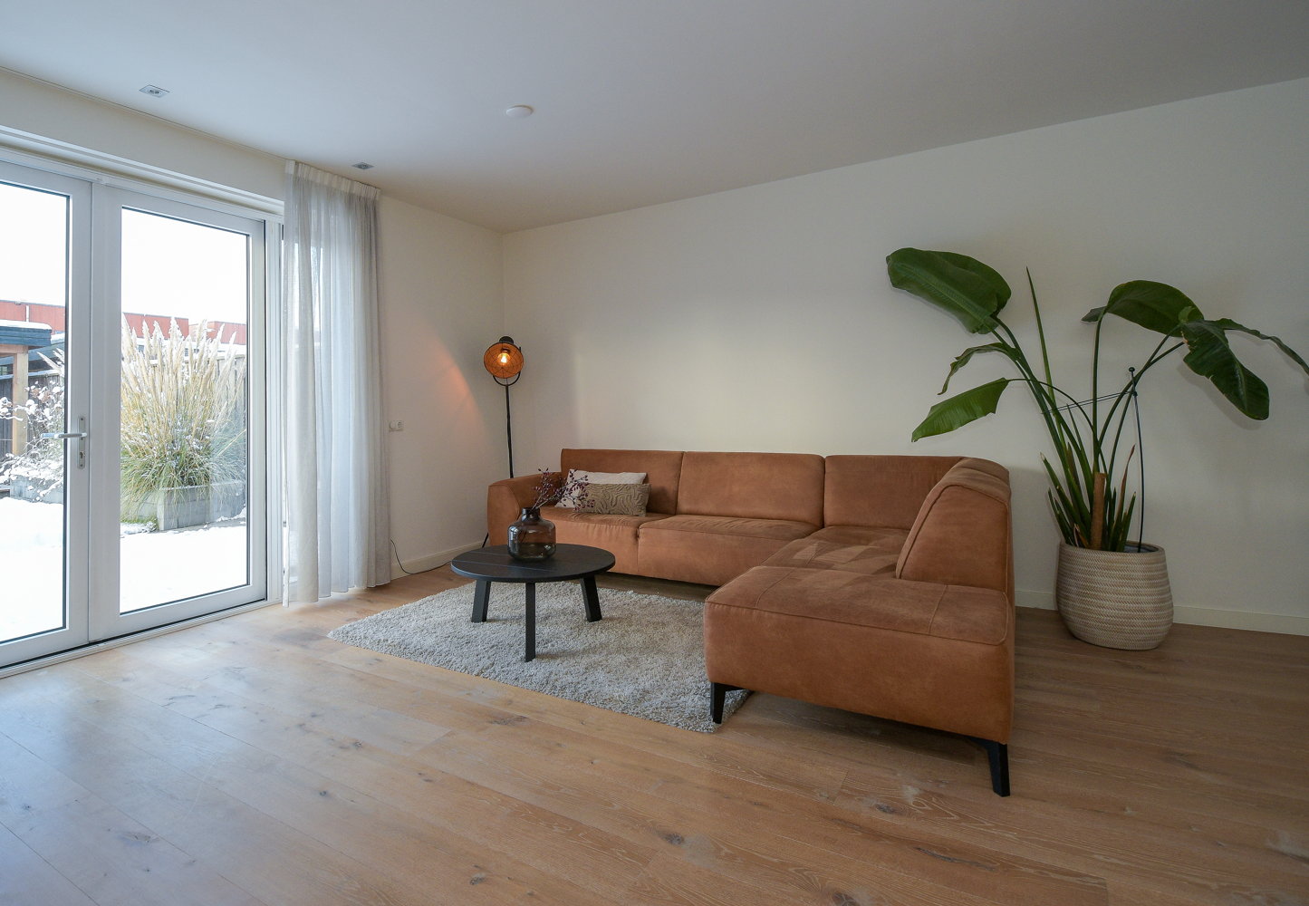Entree, modern toilet (wandcloset) met fonteintje, meterkast, trapopgang naar eerste verdieping. De stijlvolle stalen scharnierdeur geeft toegang tot de woonkamer, is vervaardigd uit zwart, gepoedercoat staal en geeft door het glas een ruimtelijk effect. De woonkamer is tijdens de bouw met 2,4 meter uitgebouw waardoor er een grote lichte ruimte is gecreëerd met openslaande tuindeuren naar het terras. Op de vloer ligt een warme sfeervolle eiken houten vloer puur wit 22 cm breed met vloerverwarming.