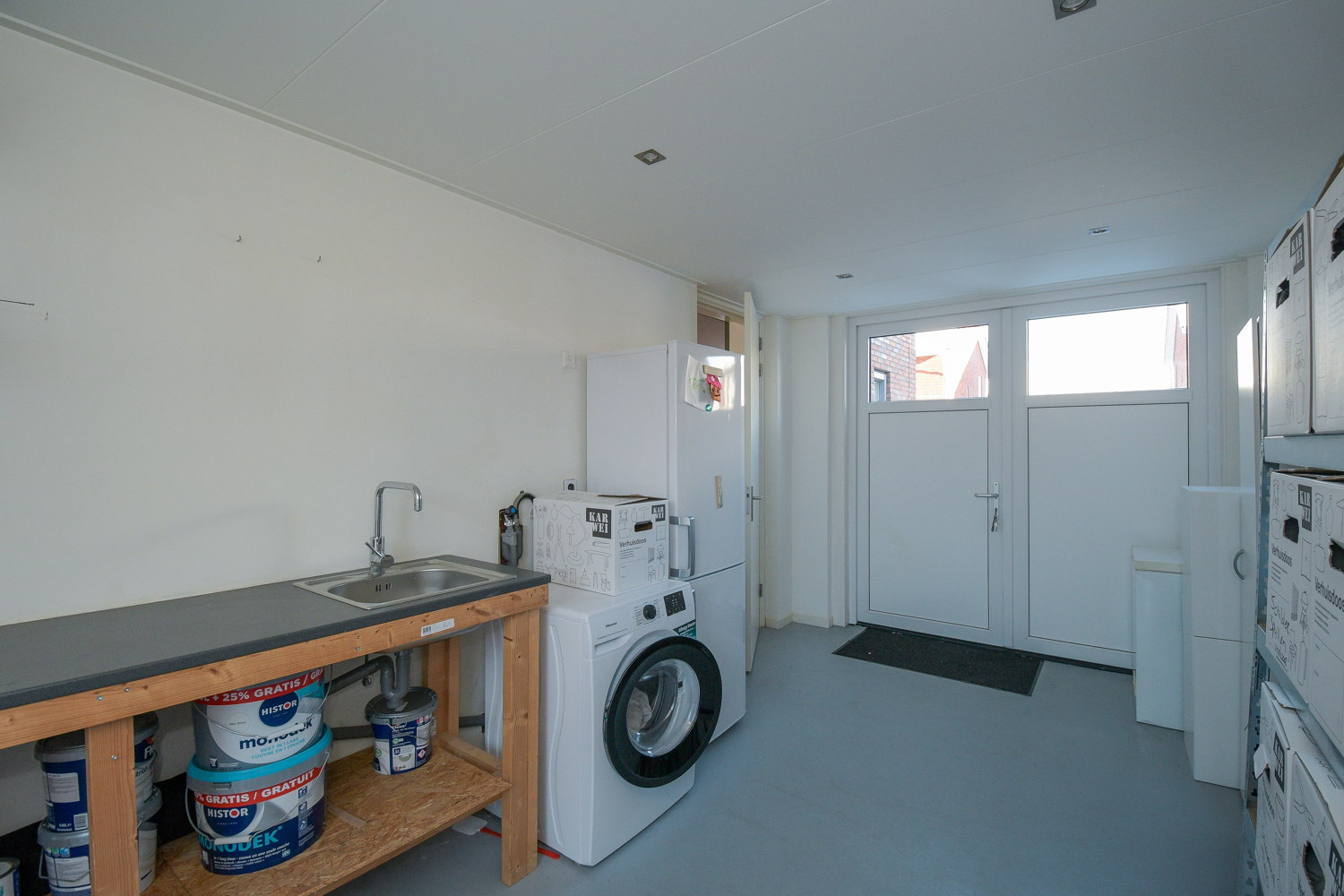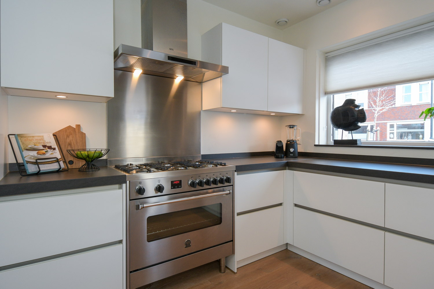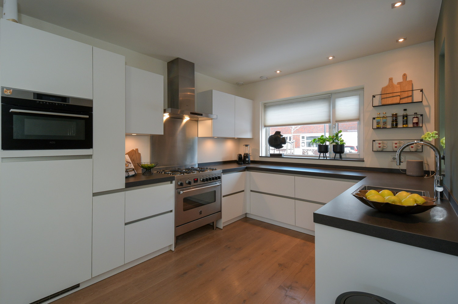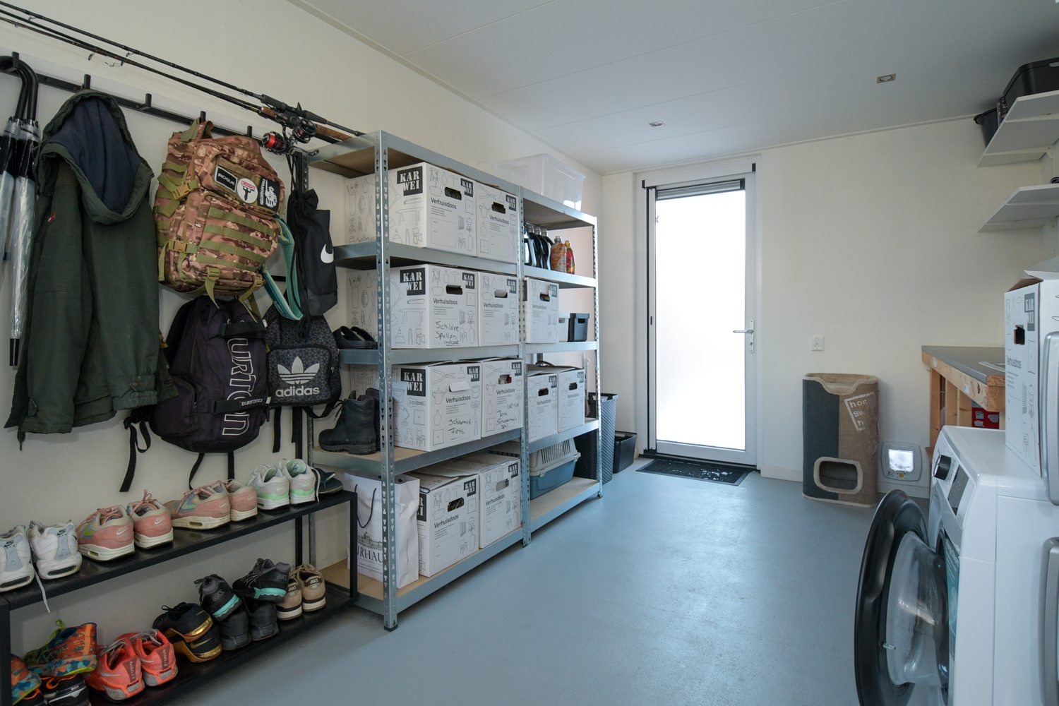 De moderne luxe keuken in lichte kleurstelling is voorzien van diverse inbouwapparatuur (AEG); 6 pits gasfornuis met oven, vaatwasser, Quooker, combimagnetron en koelkast. De keuken heeft een mooi uitzicht over de woonwijk. In de bijkeuken (voormalige garage) bevinden zich de witgoedaansluitingen. Deze ruimte is volledig geïsoleerd en voorzien van een mooie gietvloer. De strak afgewerkte en volledig geïsoleerde bijkeuken is zoveel meer dan alleen bergruimte. Dankzij de hoogwaardige afwerking en het comfortabele binnenklimaat voelt deze ruimte als een volwaardig verlengstuk van de woning.