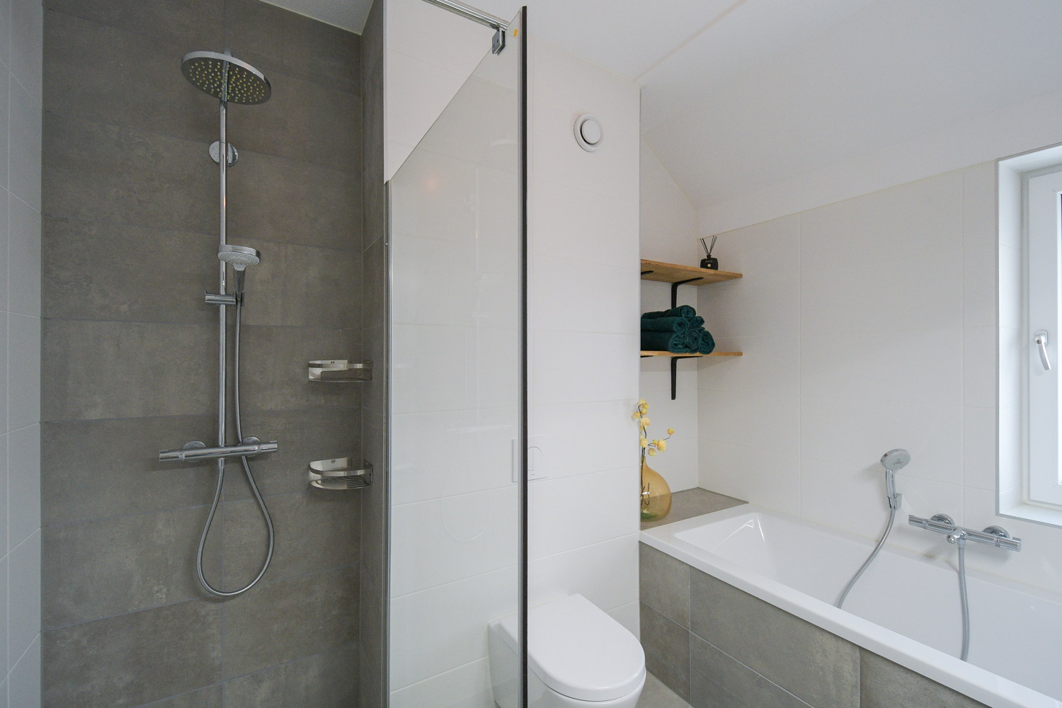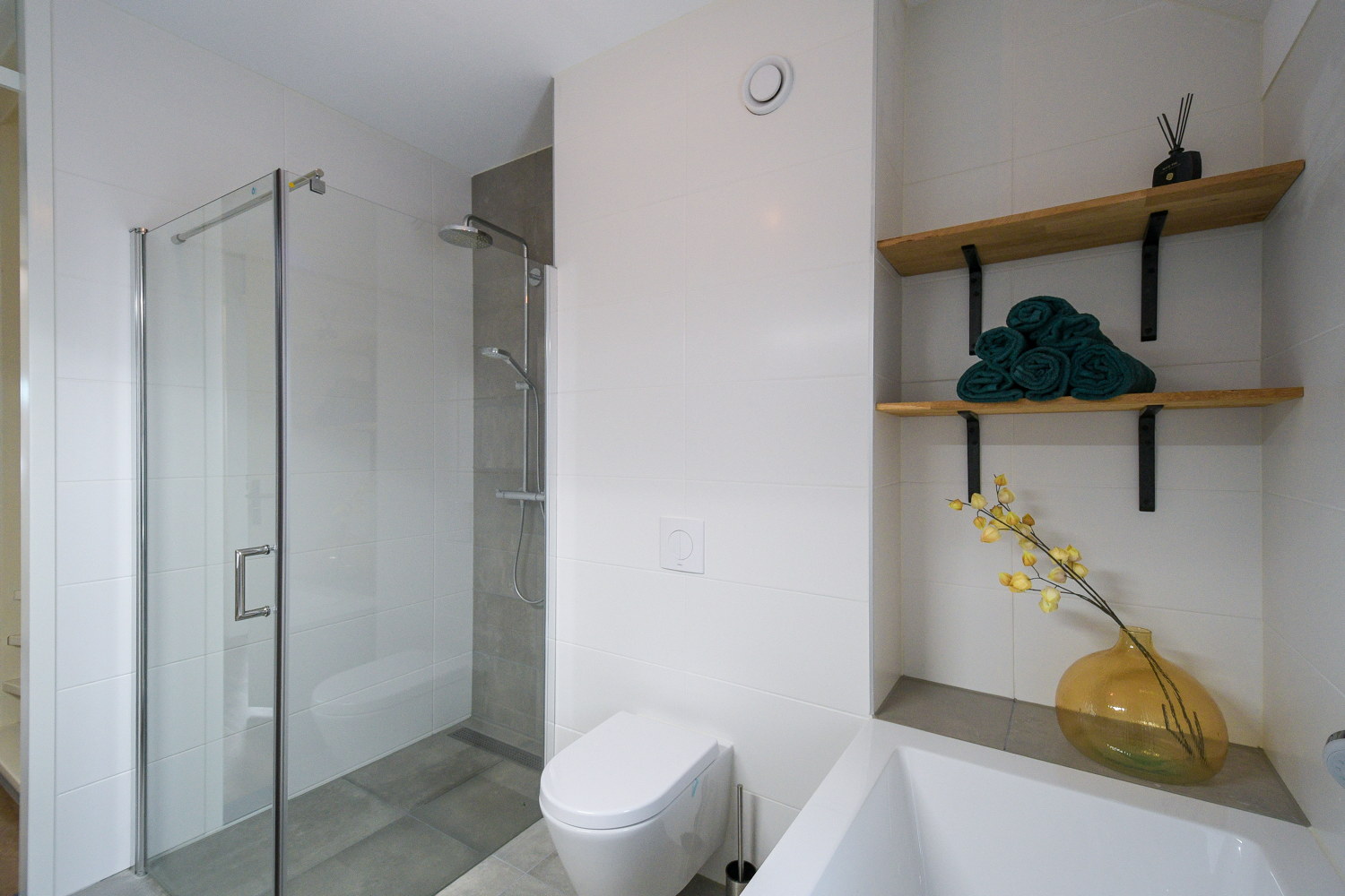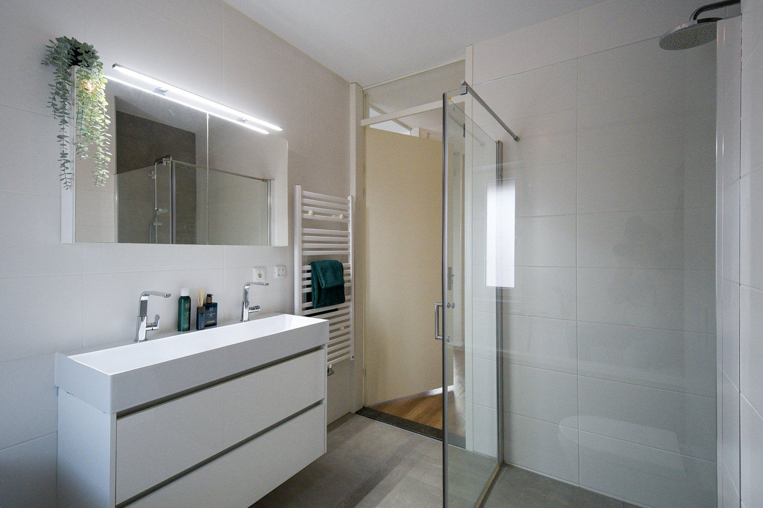 Dubbele wastafel, inloopdouche, ligbad, toilet, en wastafelmeubel