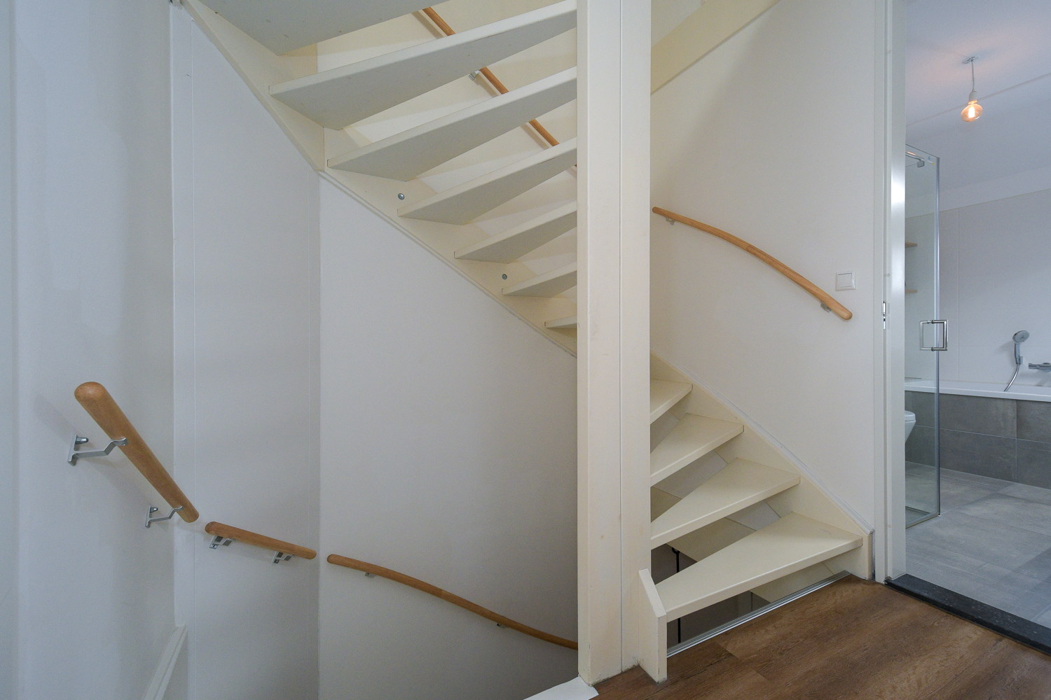 Op de eerste verdieping bevinden zich drie slaapkamers met een oppervlakte van respectievelijk ca 11,3 m2, 8,4 m2 en 17,9 m2. De hele verdieping beschikt over een prachtige PVC vloer (eiken) met vloerverwarming. De moderne luxe badkamer, geheel betegeld in modieuze kleurstelling, beschikt over een inloopdouche met regen- en handdouche, wastafelmeubel met dubbele wasbak, ligbad en tweede toilet met wandcloset.