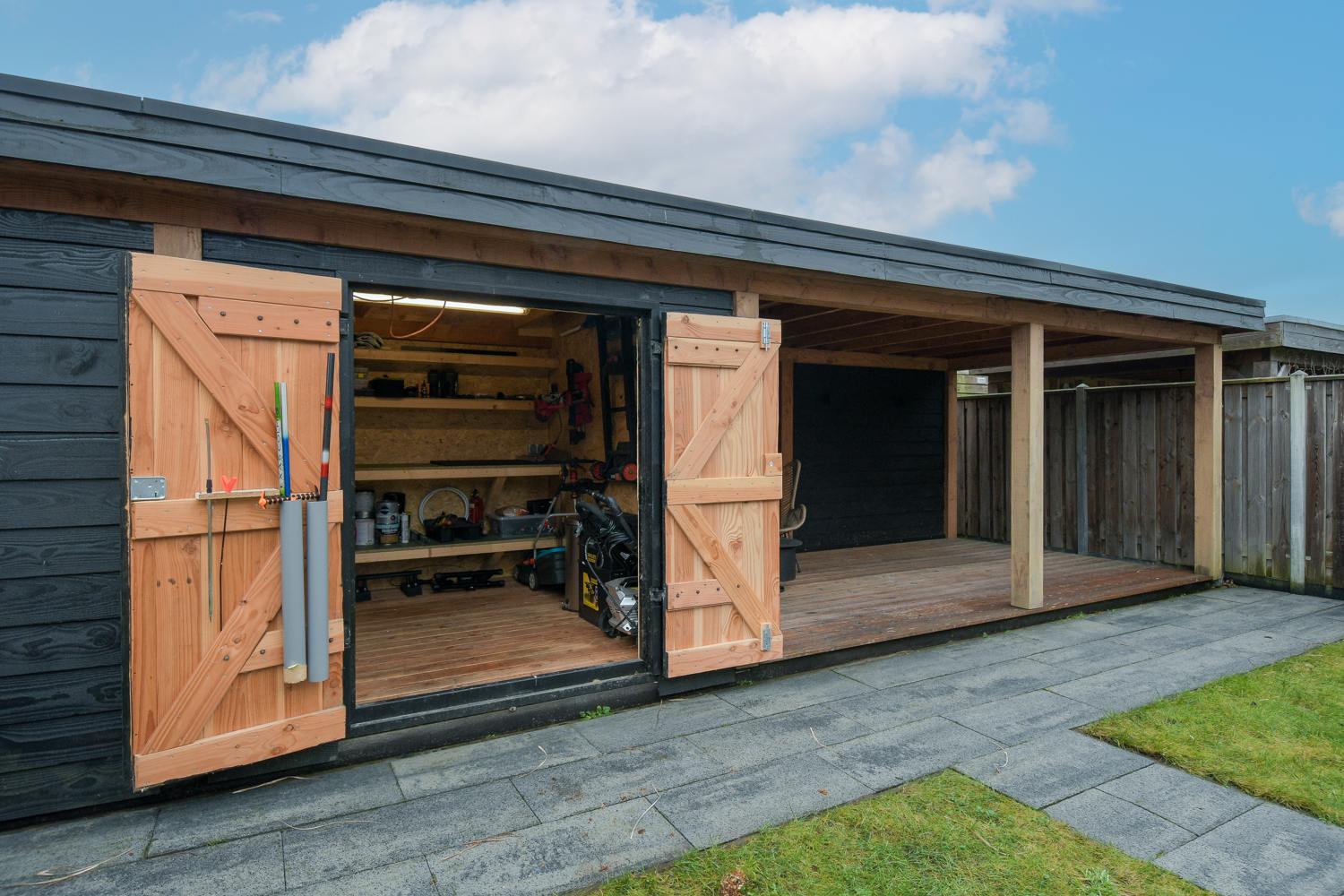 -houten overkapping met schuur over volle breedte (21 m2);