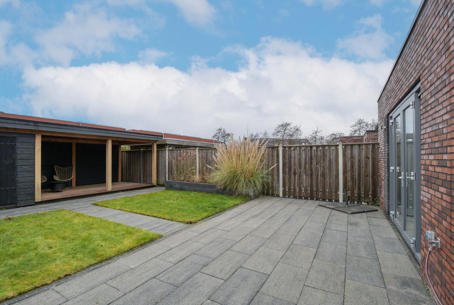 De tuin is gelegen op het zuidwesten en biedt een heerlijke plek om te relaxen. Over de volle breedte vind je een prachtige stijlvolle houten overkapping en schuur met een totale oppervlakte van ca 21 m2. Hier zit je tot in de late uurtjes droog en gezellig buiten. In de schuur is er meer dan genoeg plek voor fietsen en tuingereedschap.