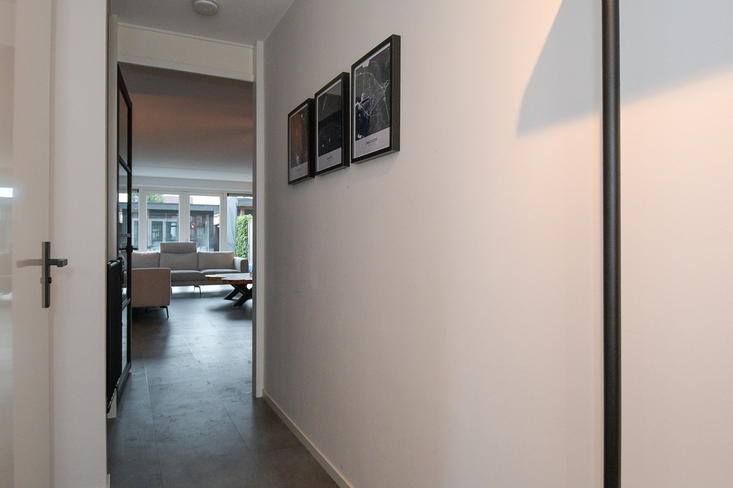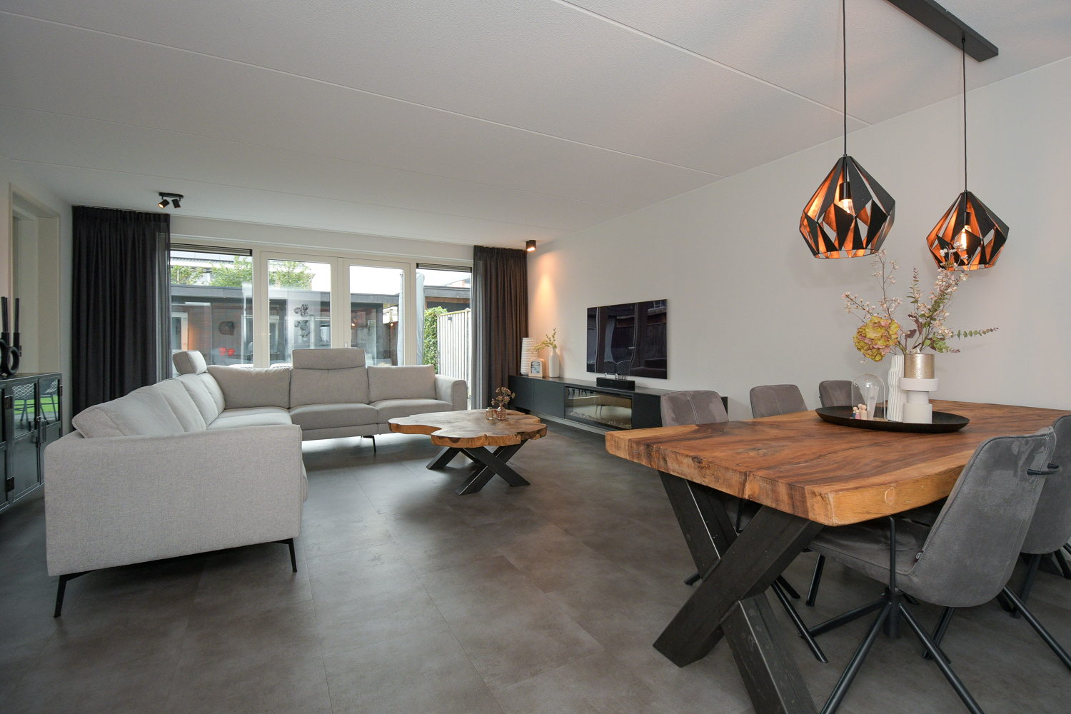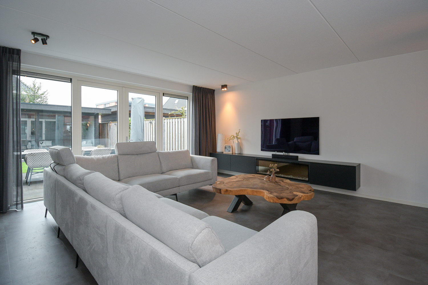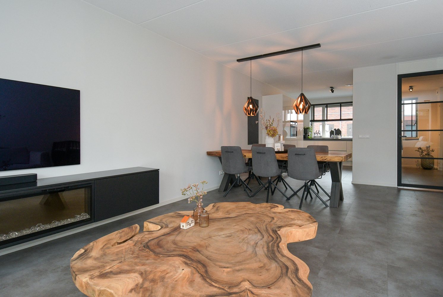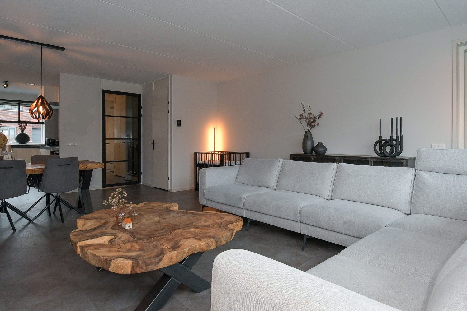 Entree, hal, meterkast, modern toilet (wandcloset) met fonteintje en trapopgang naar de eerste verdieping. De ruime woonkamer heeft een prachtige PVC vloer met vloerverwarming. Via openslaande deuren is er direct toegang tot het terras. De kamerhoge ramen halen buiten naar binnen en zorgen voor een optimale lichtbeleving.