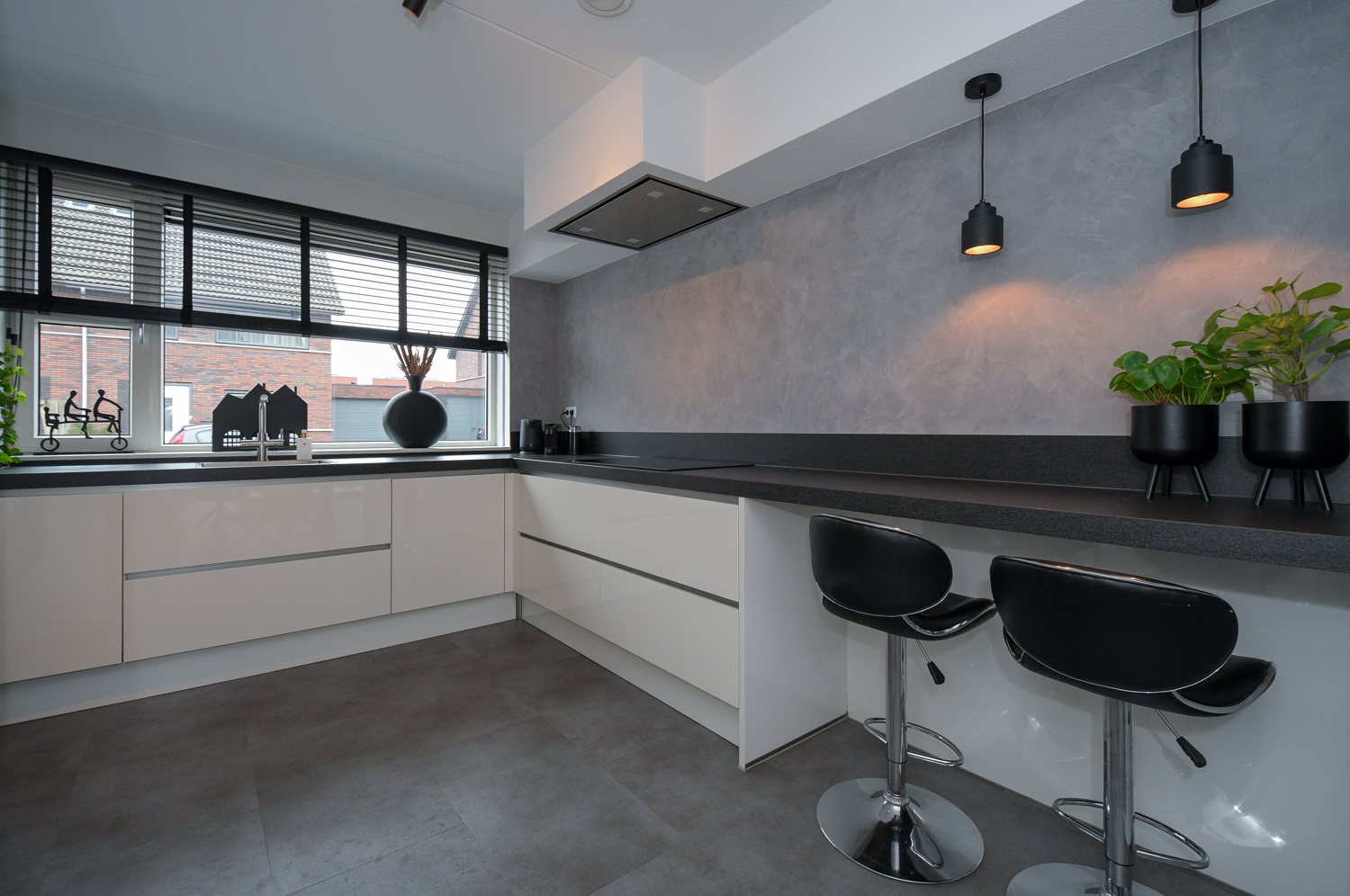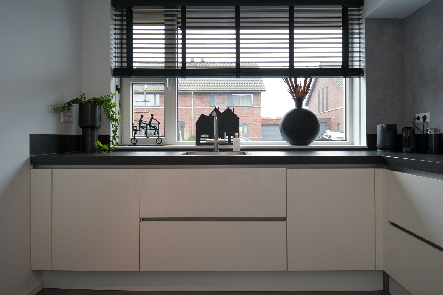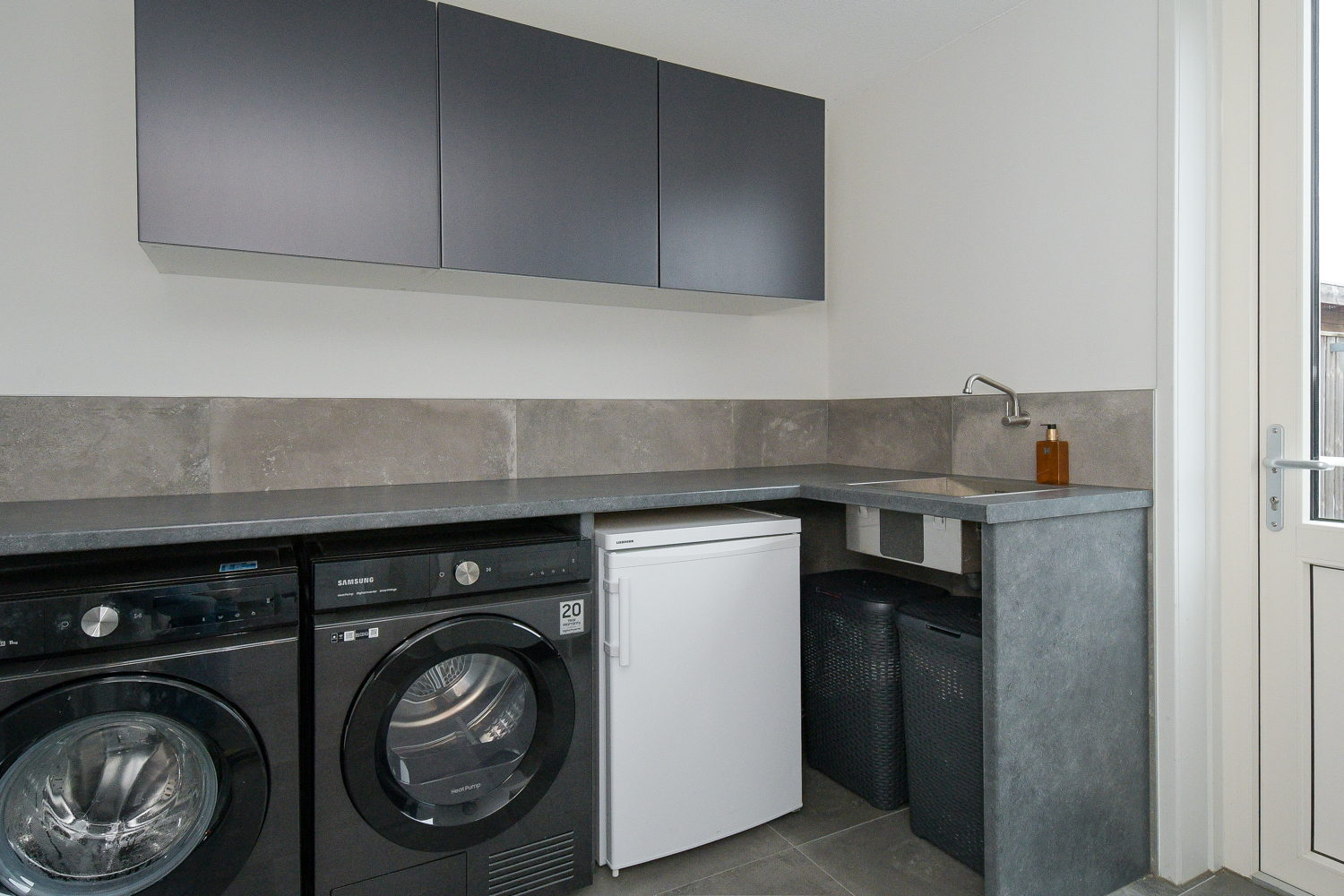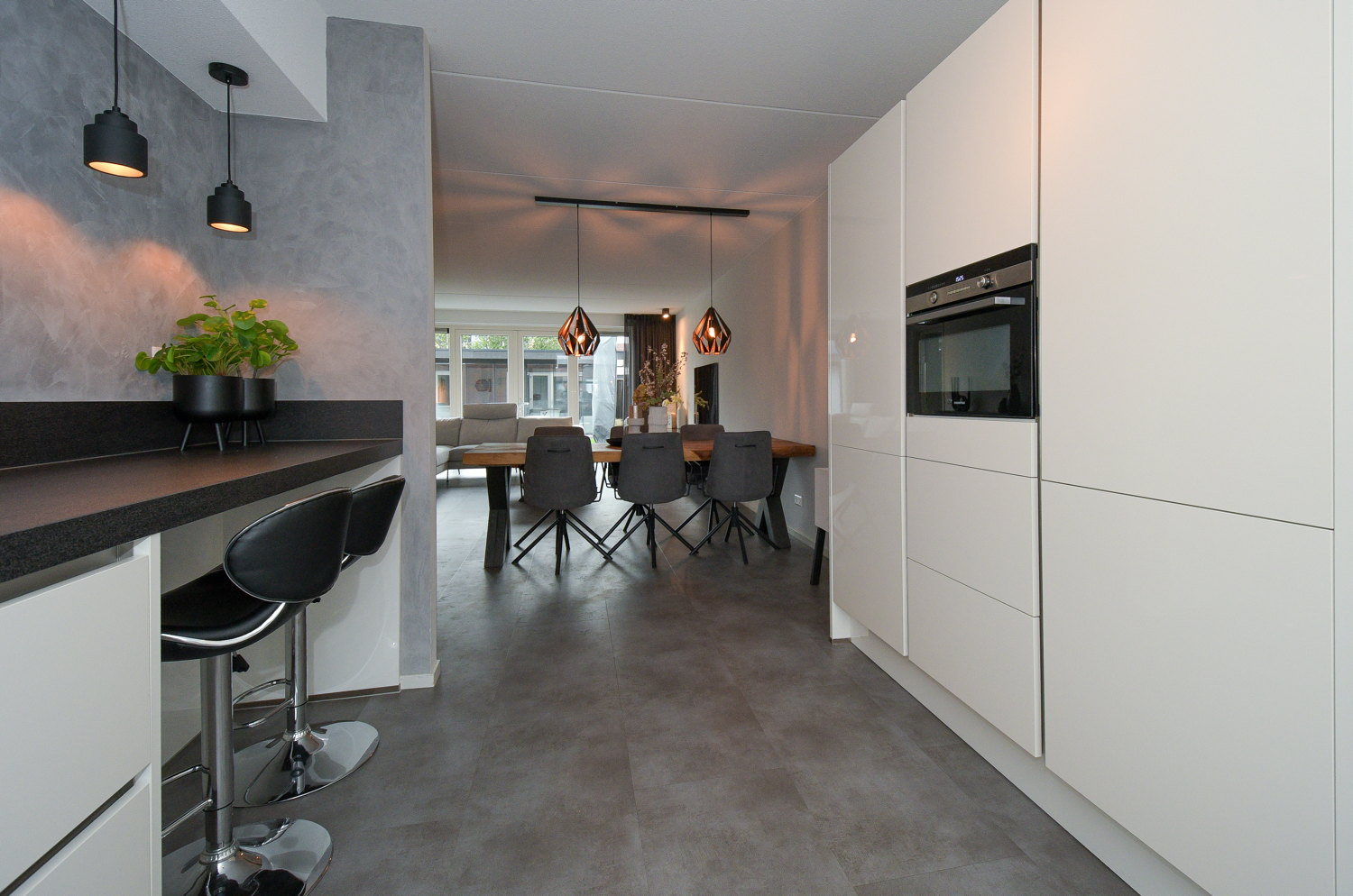 De moderne luxe keuken in lichte kleurstelling biedt uitzicht over de straat. De keuken heeft een werkblad van keramiek, is duurzaam en stijlvol en beschikt over diverse inbouw-apparatuur, waaronder; inductie koken, vaatwasser, combimagnetron/oven en koel/vries combinatie. Via de woonkamer kom je in de bijkeuken waar zich de witgoedaansluitingen bevinden. Vanuit de bijkeuken is er toegang tot de geïsoleerde garage.