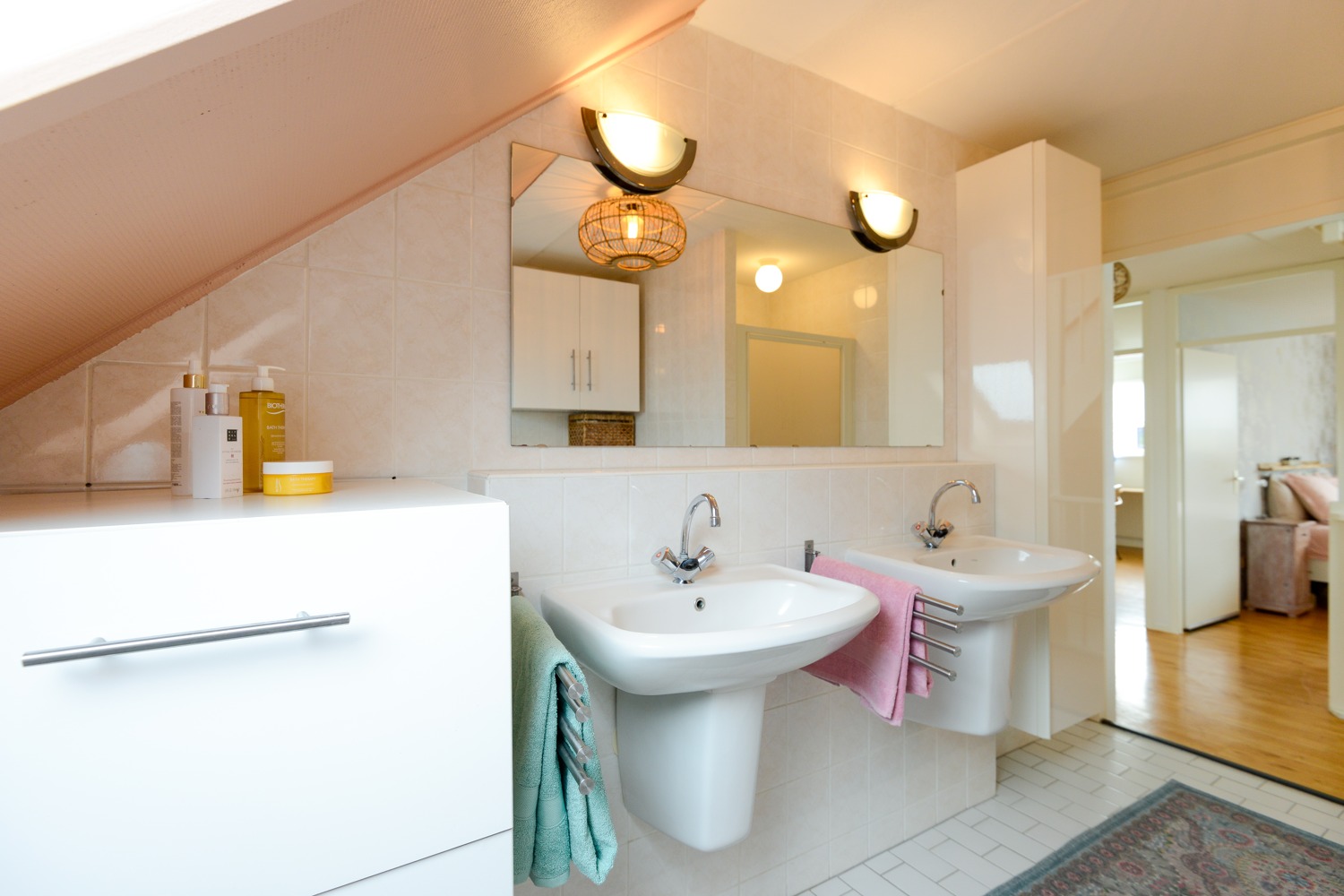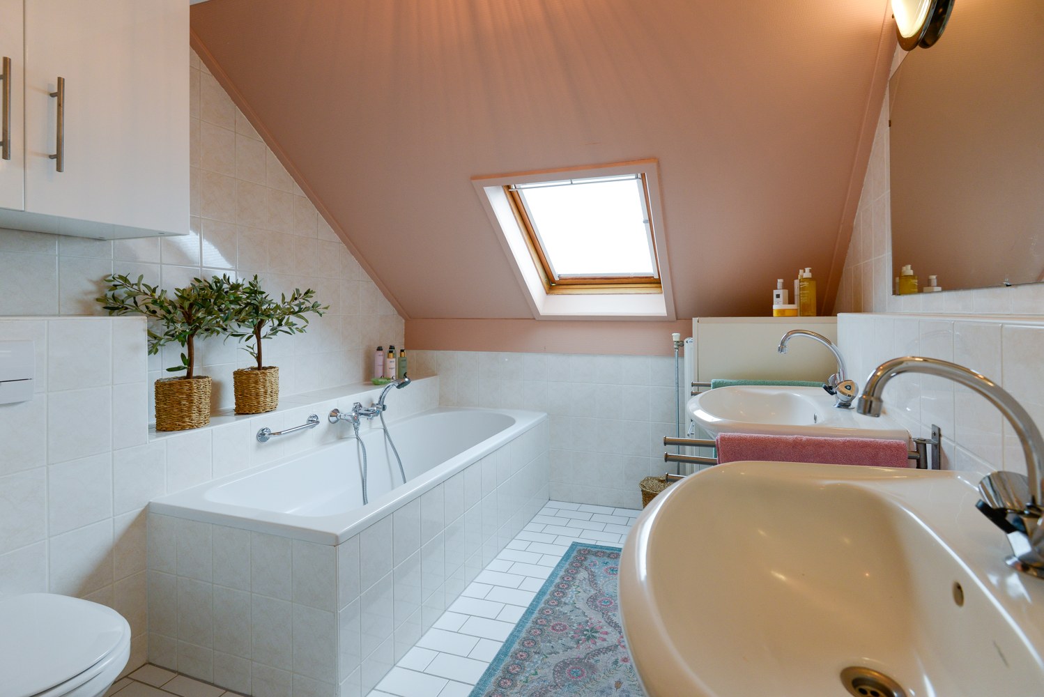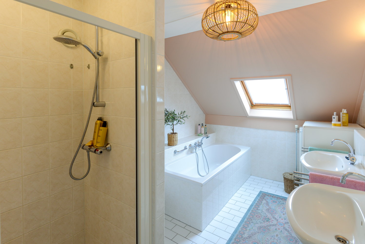 Badkamervoorzieningen Dubbele wastafel, inloopdouche, ligbad, en toilet