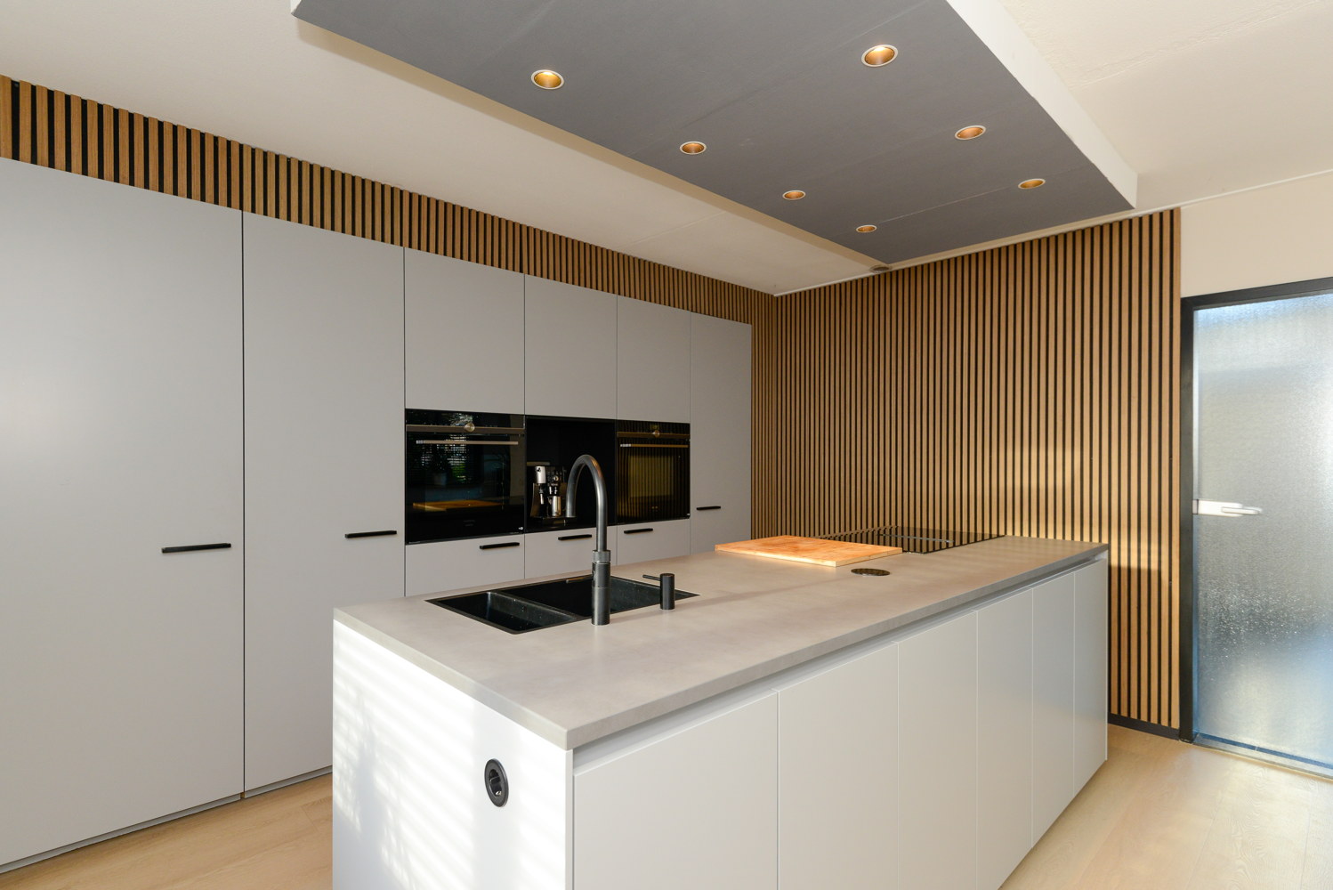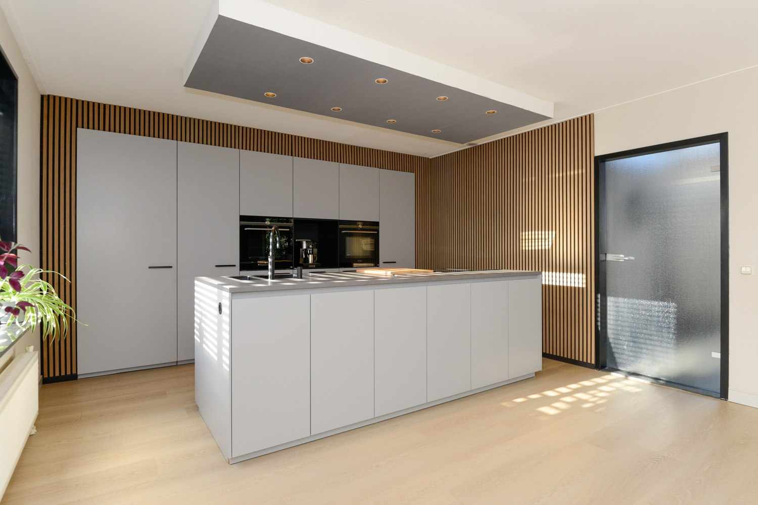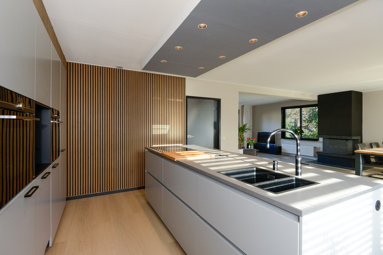De nieuwe, moderne en luxe op maat gemaakte keuken (next125) met kookeiland heeft een lichte kleurstelling en een keramiek werkblad in betonlook. De keuken beschikt over diverse inbouwapparatuur, waaronder; vaatwasser, quooker, stoomoven, combimagnetron en inductie kookplaat. Alle apparatuur is van het topmerk Siemens en voorzien van wifi. De achterwand van de keuken is voorzien van akoestische wandpanelen, welke niet alleen zorgen voor geluidsabsorptie maar tevens een warme en modieuze uitstraling bieden. Ander uniek punt van de keuken is de deur naar de bijkeuken, de deur is weggewerkt in de achterwand van de keuken, en geeft zo een unieke en strakke uitstraling.