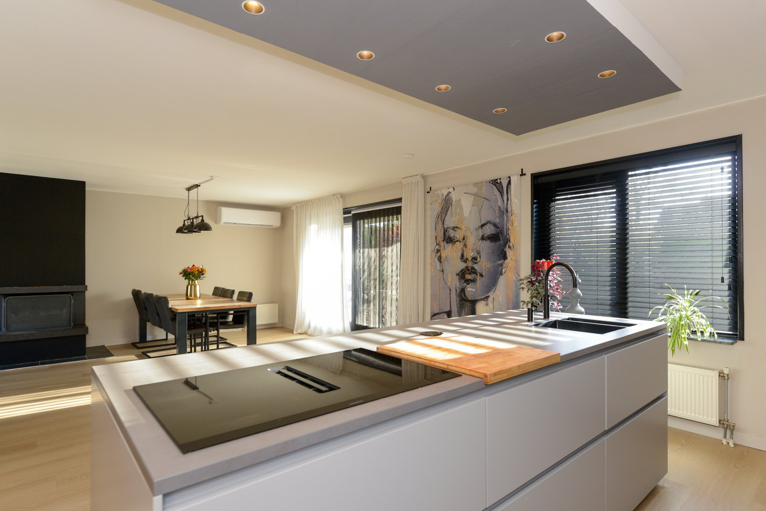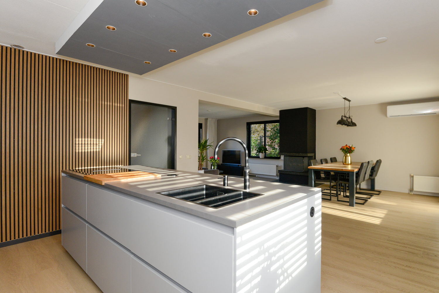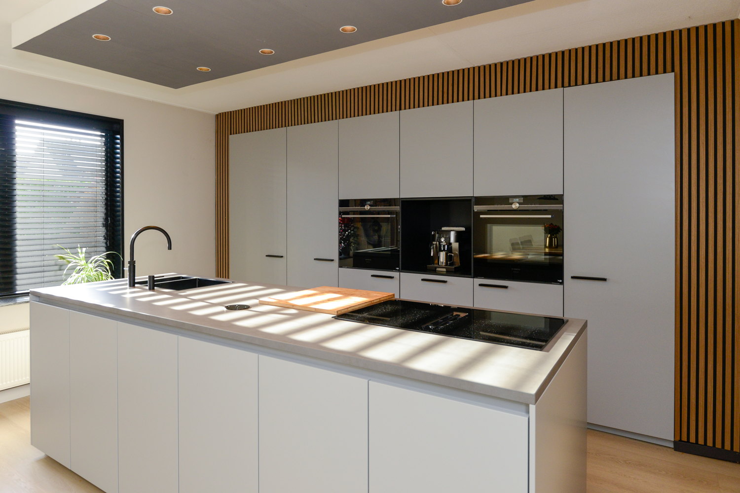 De nieuwe, moderne en luxe op maat gemaakte keuken (next125) met kookeiland heeft een lichte kleurstelling en een keramiek werkblad in betonlook. De keuken beschikt over diverse inbouwapparatuur, waaronder; vaatwasser, quooker, stoomoven, combimagnetron en inductie kookplaat. Alle apparatuur is van het topmerk Siemens en voorzien van wifi. De achterwand van de keuken is voorzien van akoestische wandpanelen, welke niet alleen zorgen voor geluidsabsorptie maar tevens een warme en modieuze uitstraling bieden. Ander uniek punt van de keuken is de deur naar de bijkeuken, de deur is weggewerkt in de achterwand van de keuken, en geeft zo een unieke en strakke uitstraling.