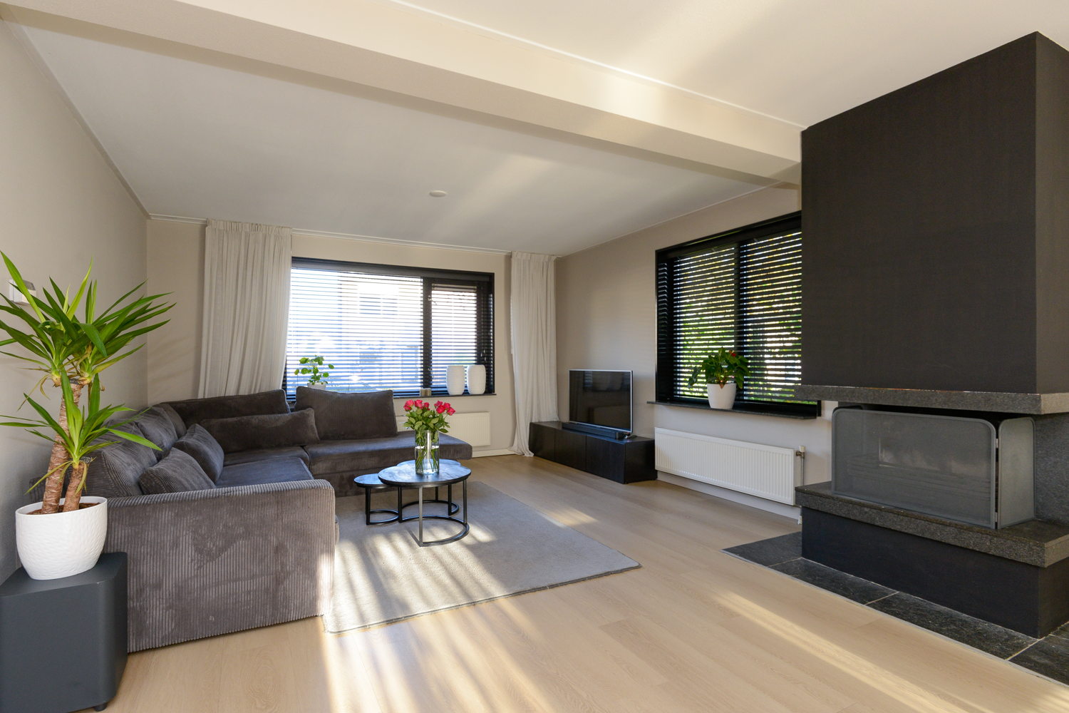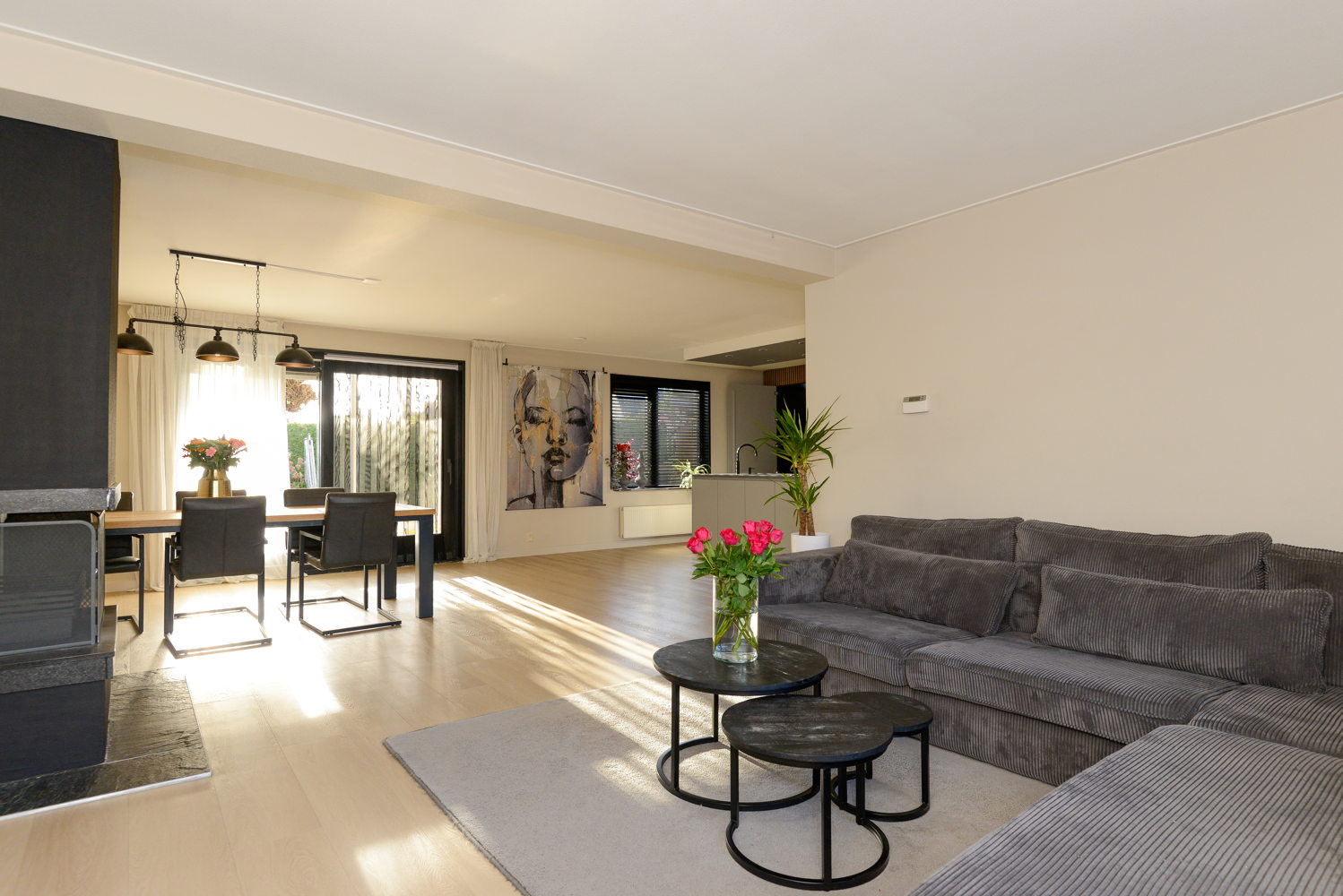 Entree/hal met natuurstenen vloer, modern luxe toilet, recentelijk vernieuwd en extra ruim met wandcloset, urinoir en fonteintje. Trapopgang naar verdieping en toegang tot kantoor. De meterkast is vernieuwd. Via de stijlvolle, gehard glazen binnendeur kom je in de woonkamer. In de woonkamer ligt een nieuwe PVC vloer en de aanwezige open haard zorgt voor extra sfeer. In de achterkamer bevindt zich de airco en een schuifpui, welke toegang geeft tot het terras met een stalen tuinoverkapping met twee lichtkoepels. Op dit terras is een vaste buitenhaard/BBQ geplaatst.
