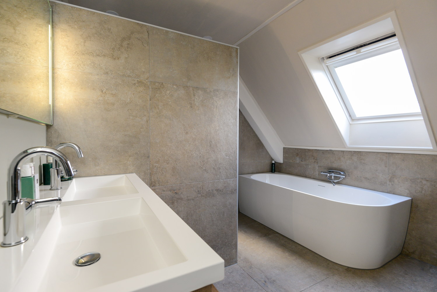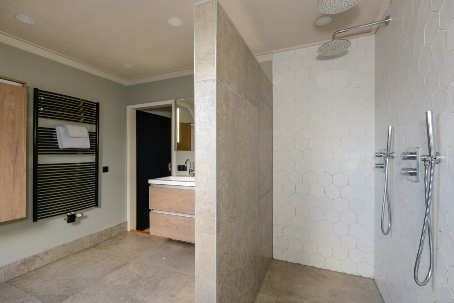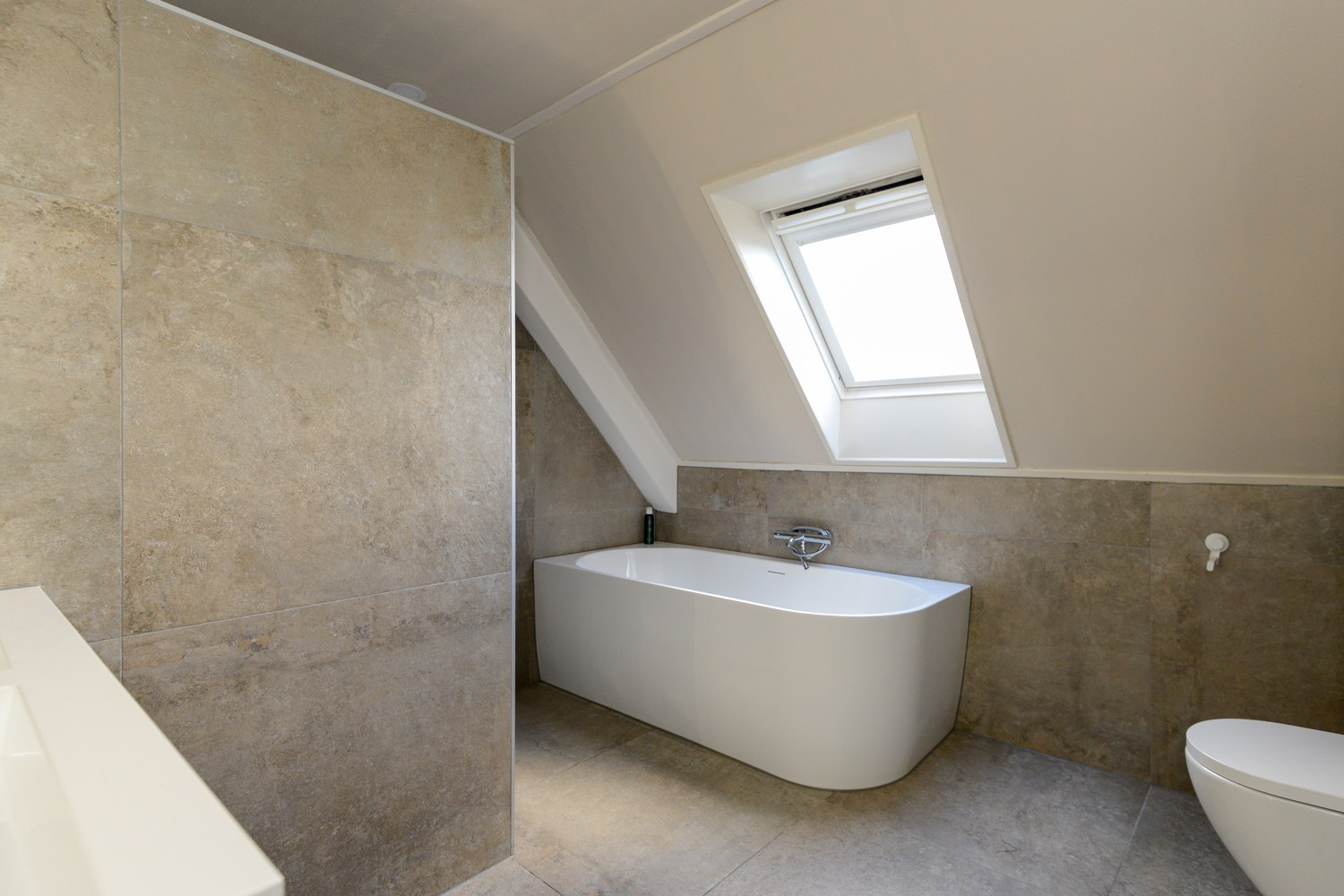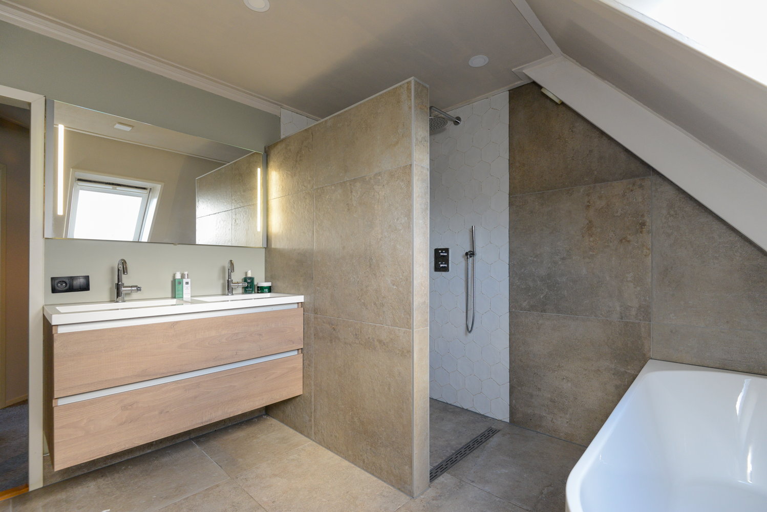 Inloopdouche, ligbad, toilet, en wastafel