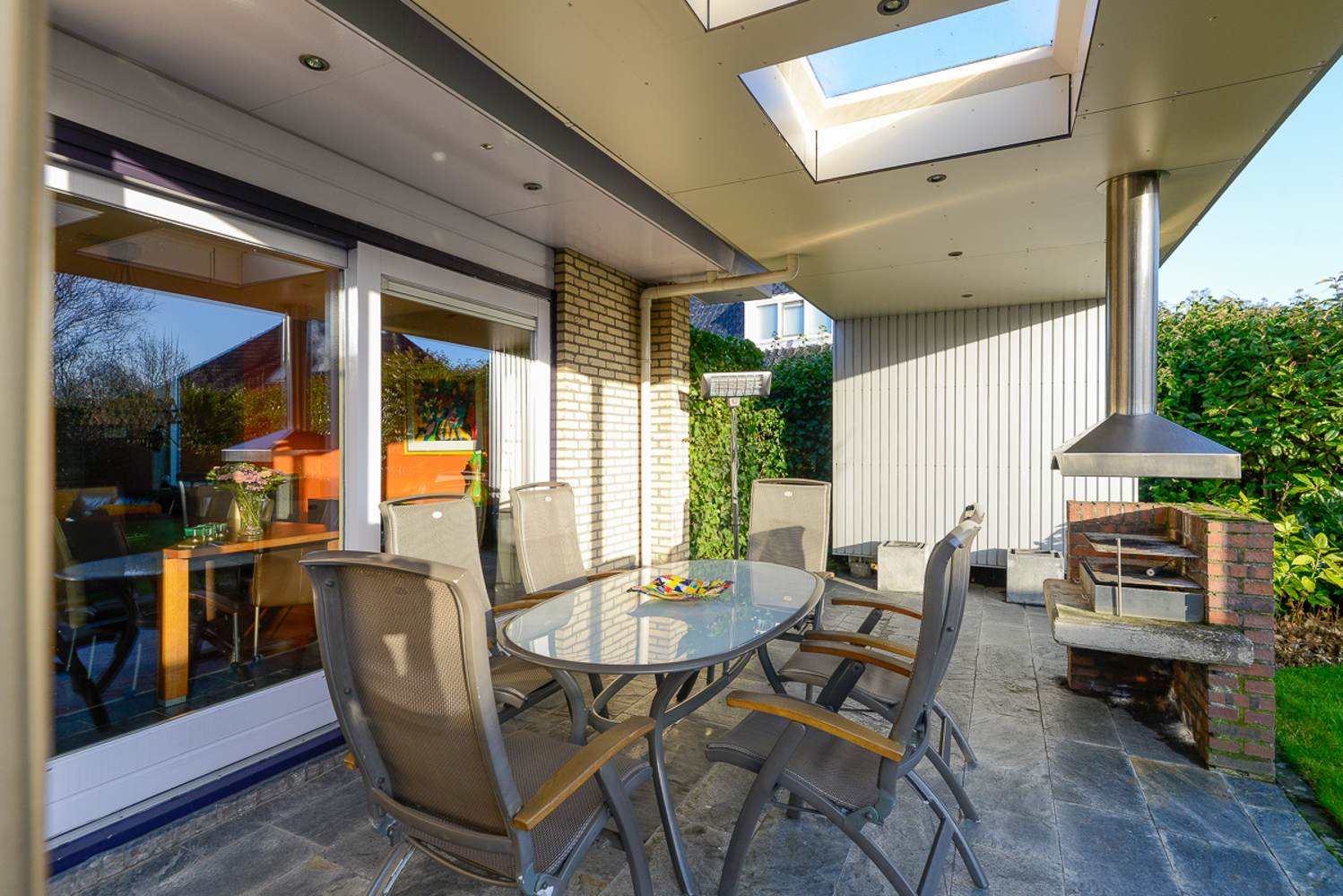 -stalen tuinoverkapping met natuurstenen vloer, open haard en BBQ (2002);