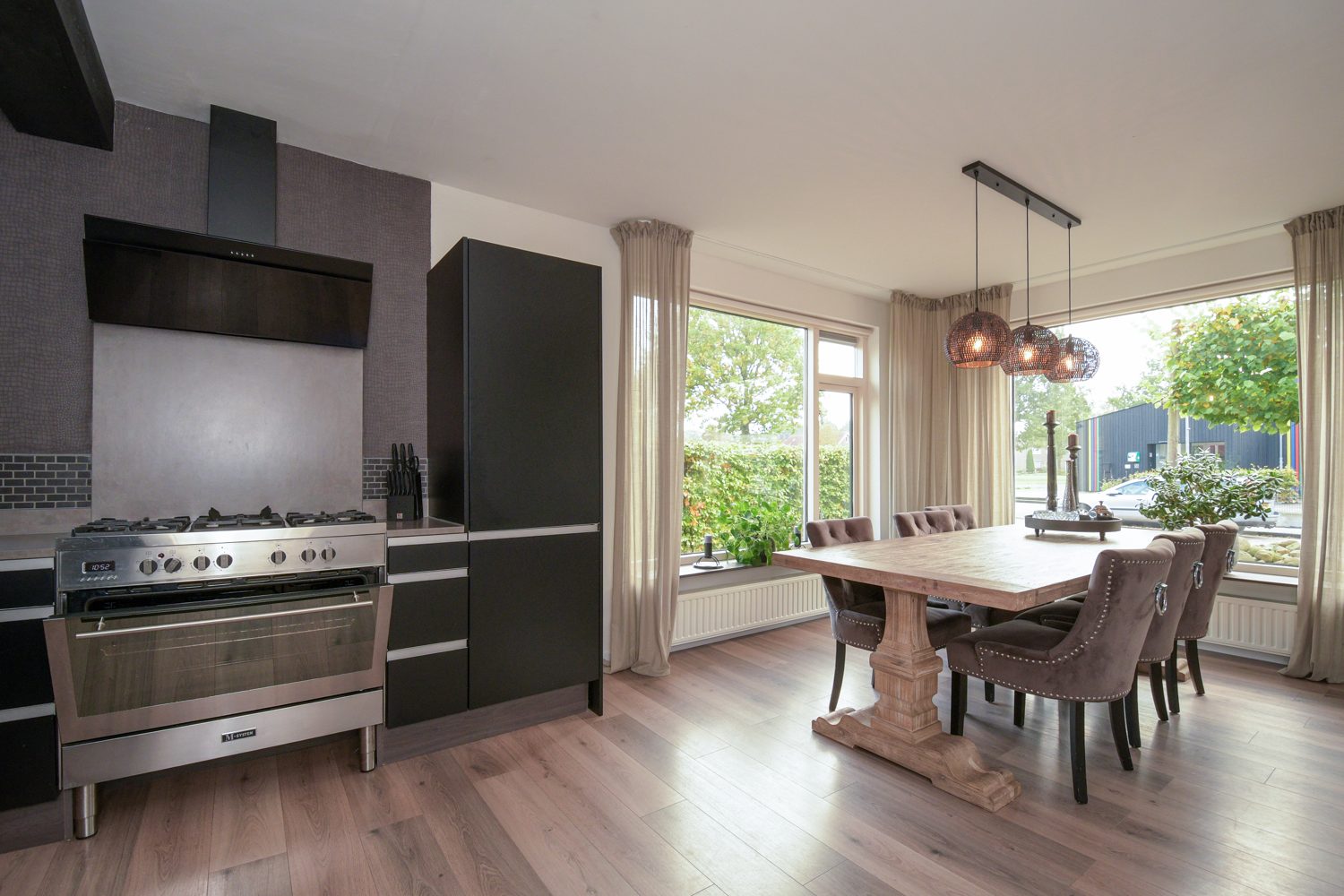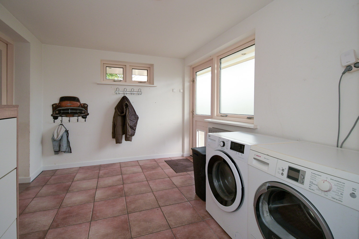 De mooie lichte woonkamer heeft een open verbinding met de moderne luxe keuken, welke beschikt over diverse inbouwapparatuur; combimagnetron, koel-vries combinatie, vaatwasser en een grote vijf-pits gasfornuis met oven. Vanuit de keuken is er nog toegang tot de bijkeuken waar de CV ketel, merk Daalderop met bouwjaar 2006 en de witgoedaansluitingen staan opgesteld.