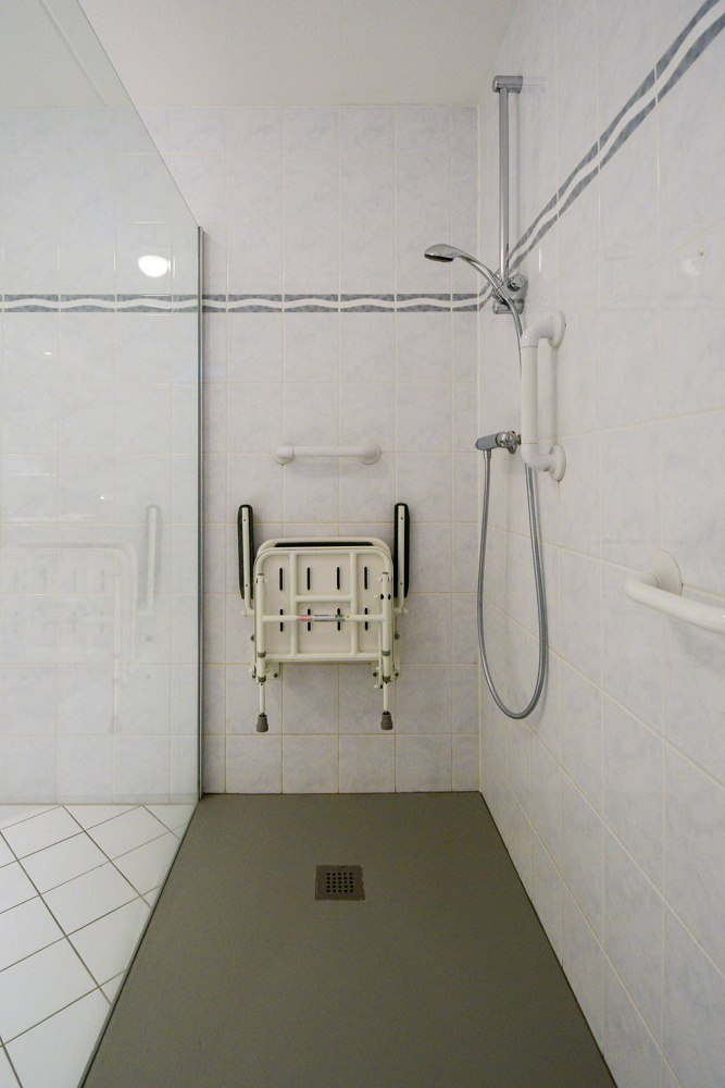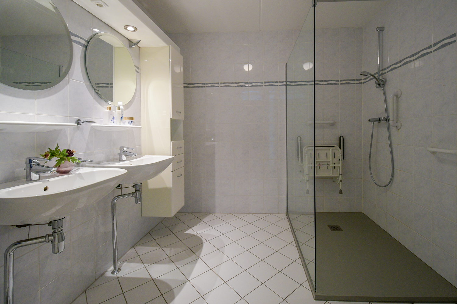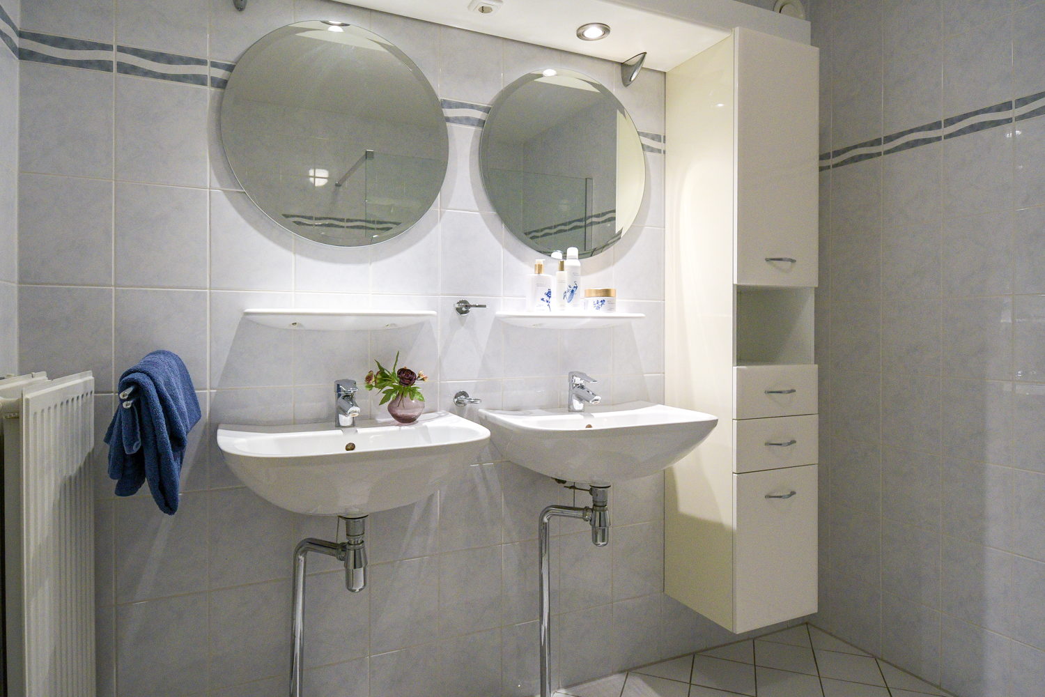 Dubbele wastafel, inloopdouche, en wastafelmeubel